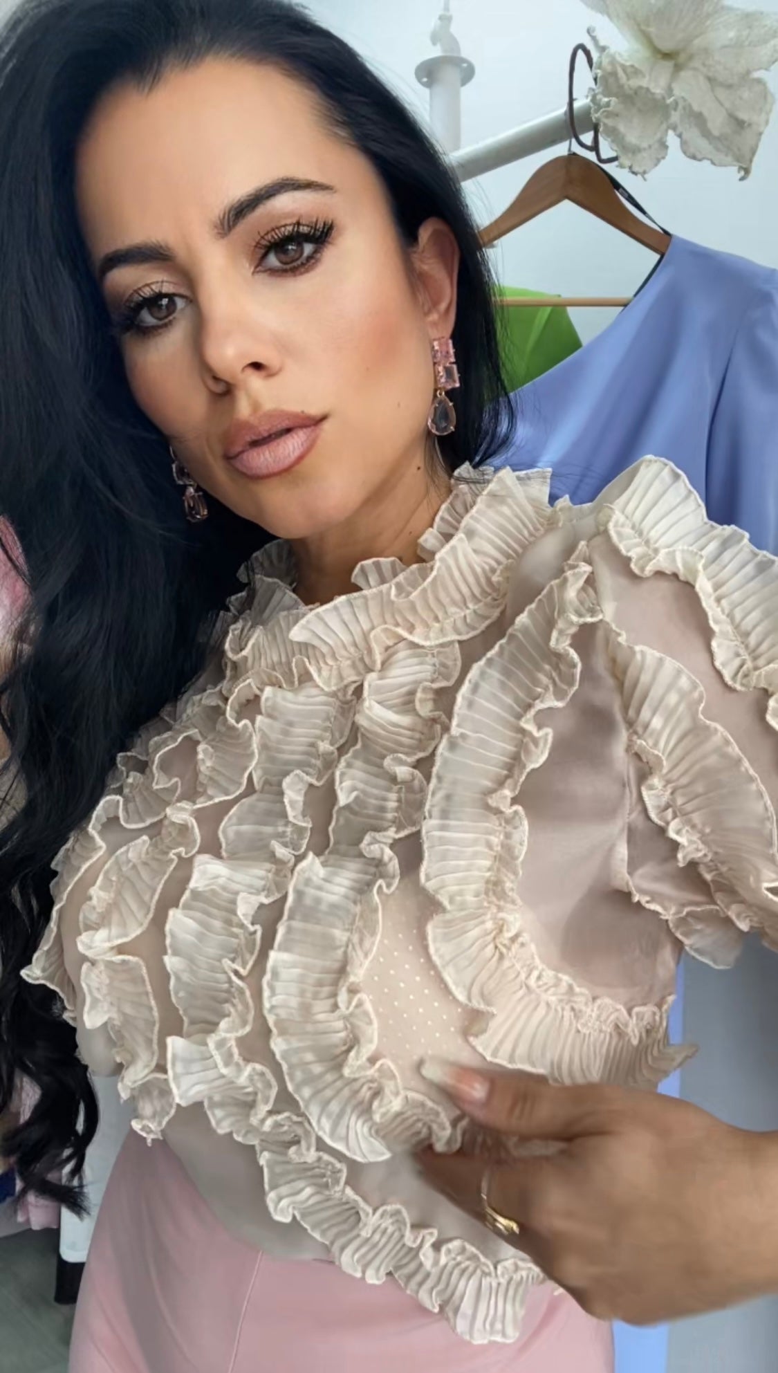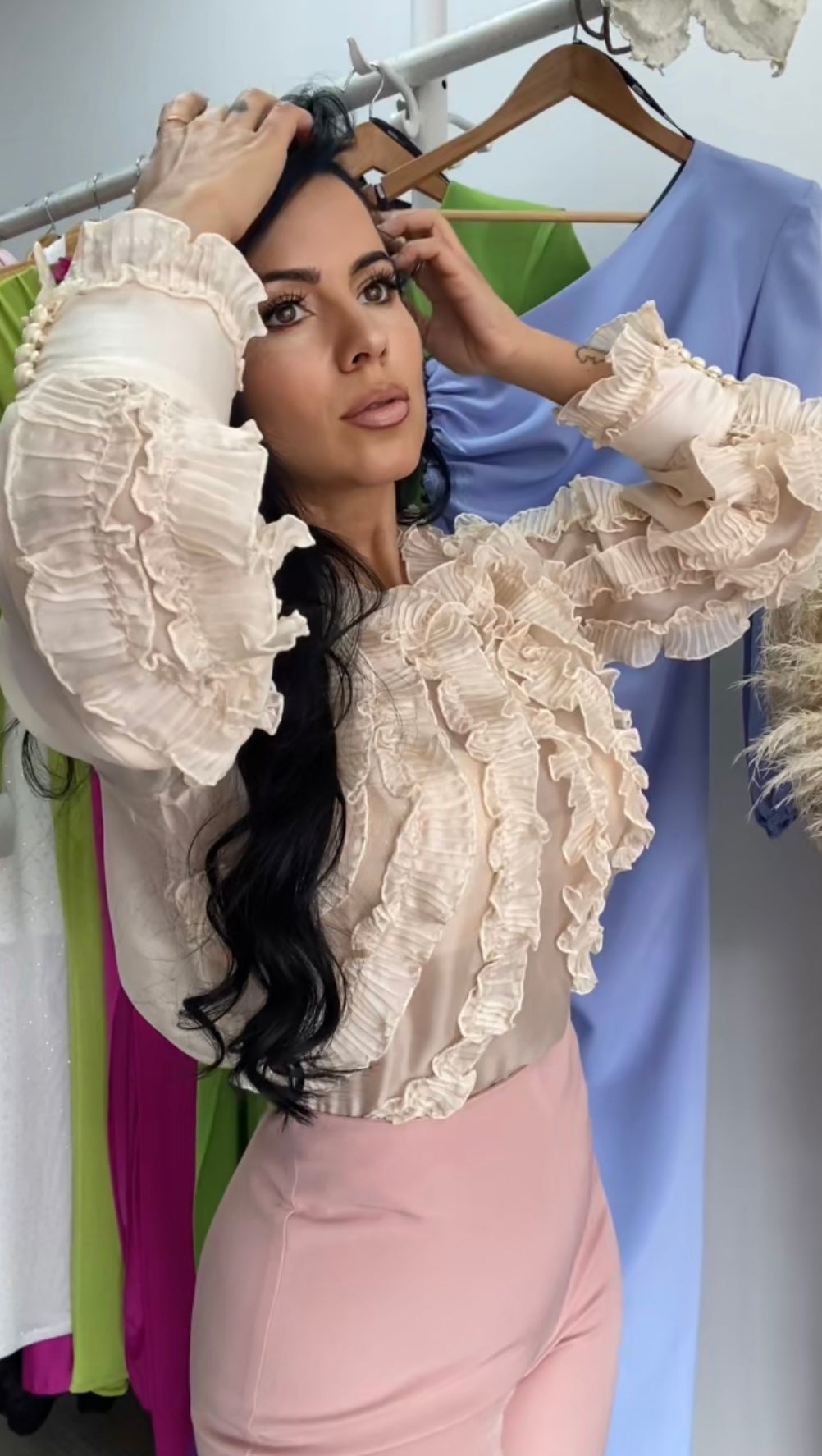Preciosa camisa confeccionada en tejido gasa con detalles de transparencias y volantes,muy buena calidad, puño ancho con detalles de botones al tono, nuestra camisa Rocio es elegante,sofisticada, cómoda perfecta para cualquier evento.FABRICADA EN ESPAÑA.