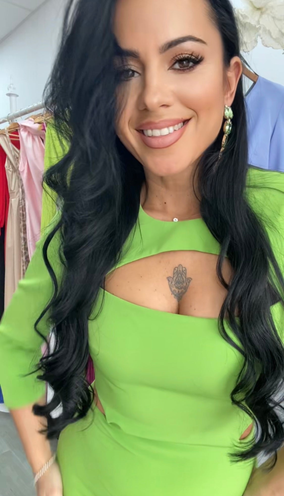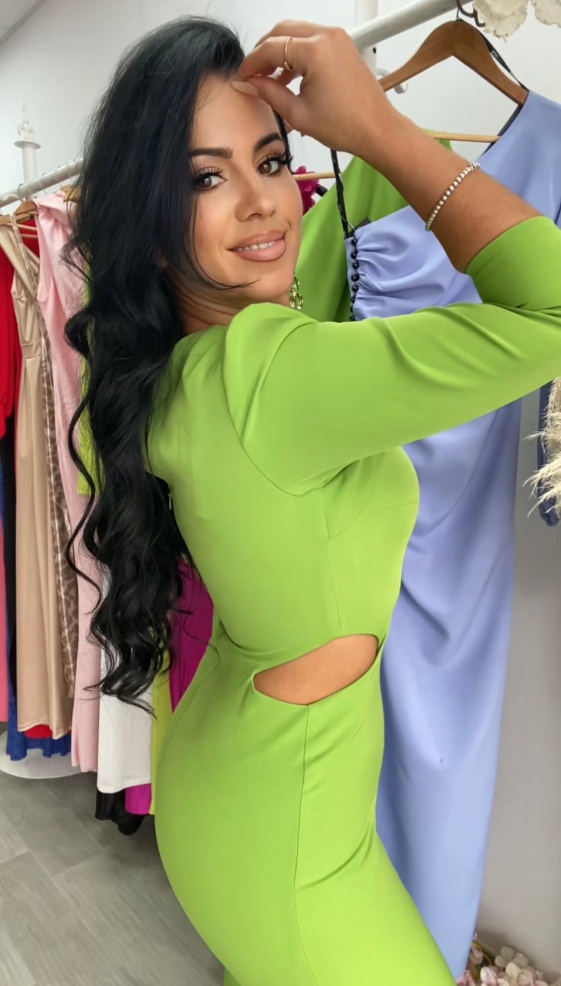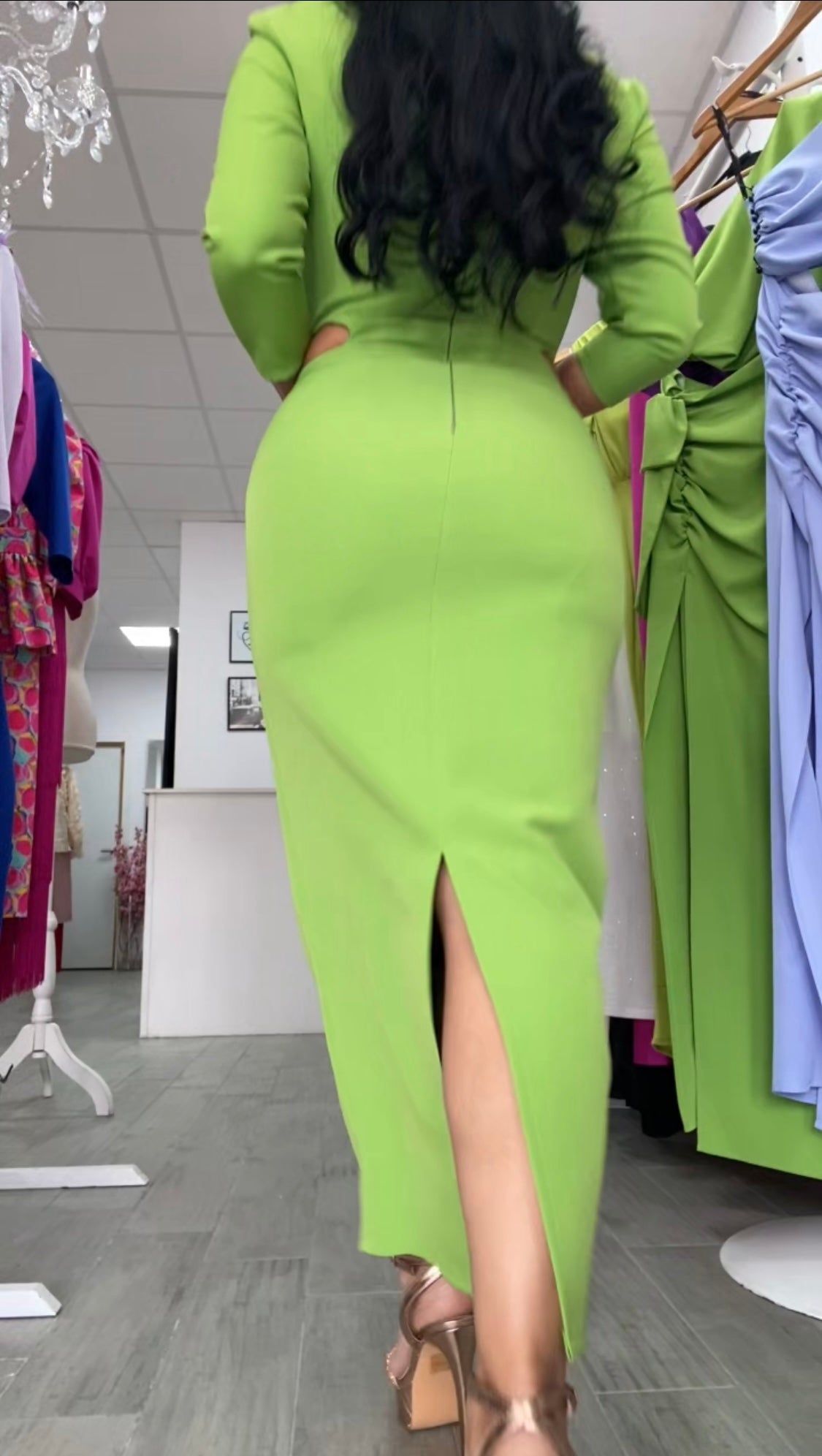 Precioso vestido confeccionado en crepe, tela con algo de licra, lleva forro de licra muy buena calidad,corte entallado con abertura trasera,diseño en cintura con abertura, escote con abertura,incluye hombreras,cremallera invisible trasera,perfecto para tus eventos.FABRICADO EN ESPAÑA.