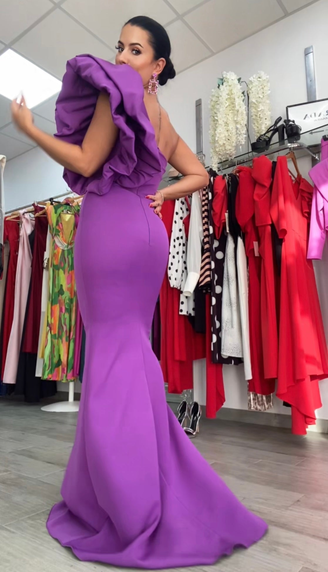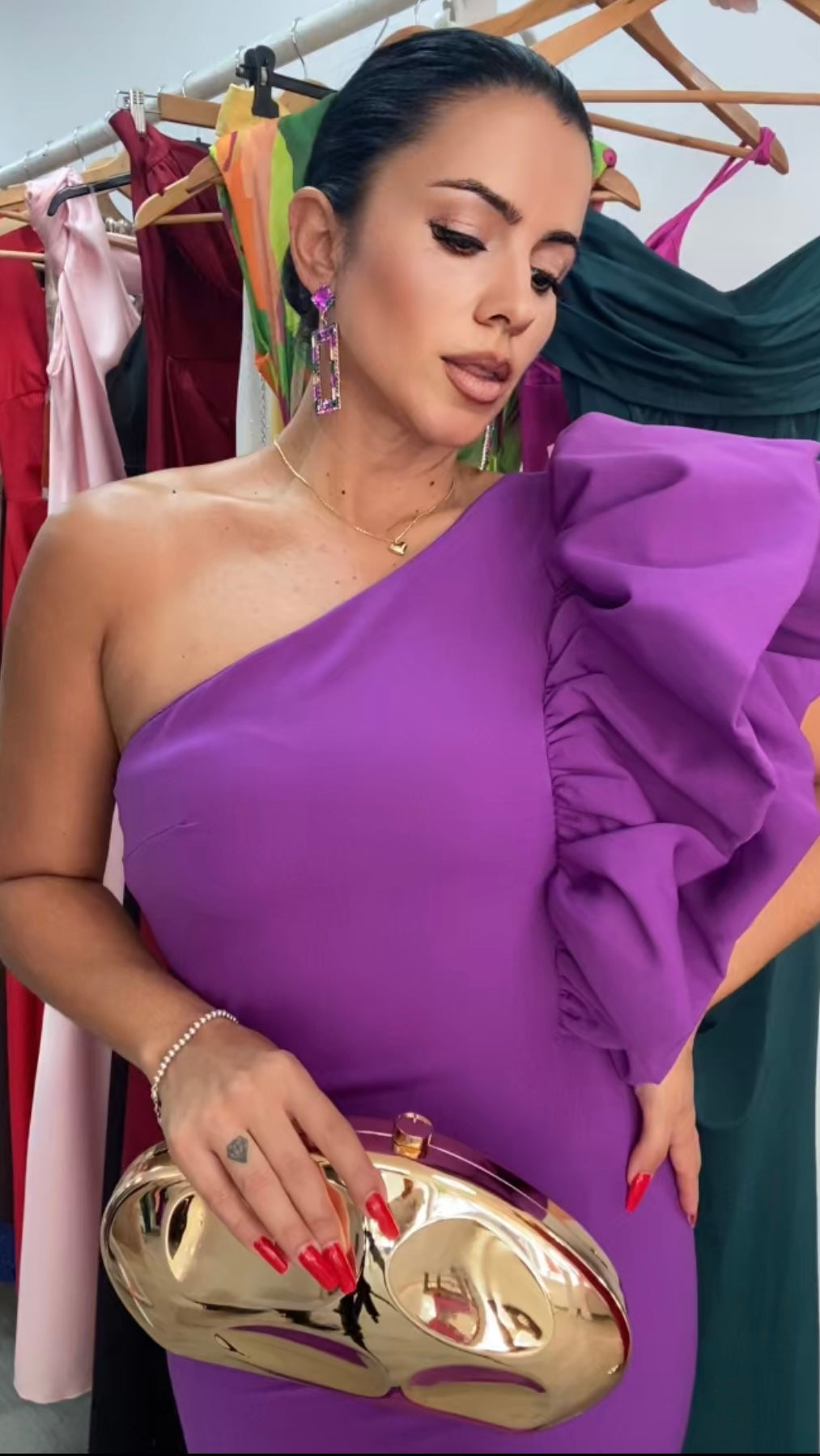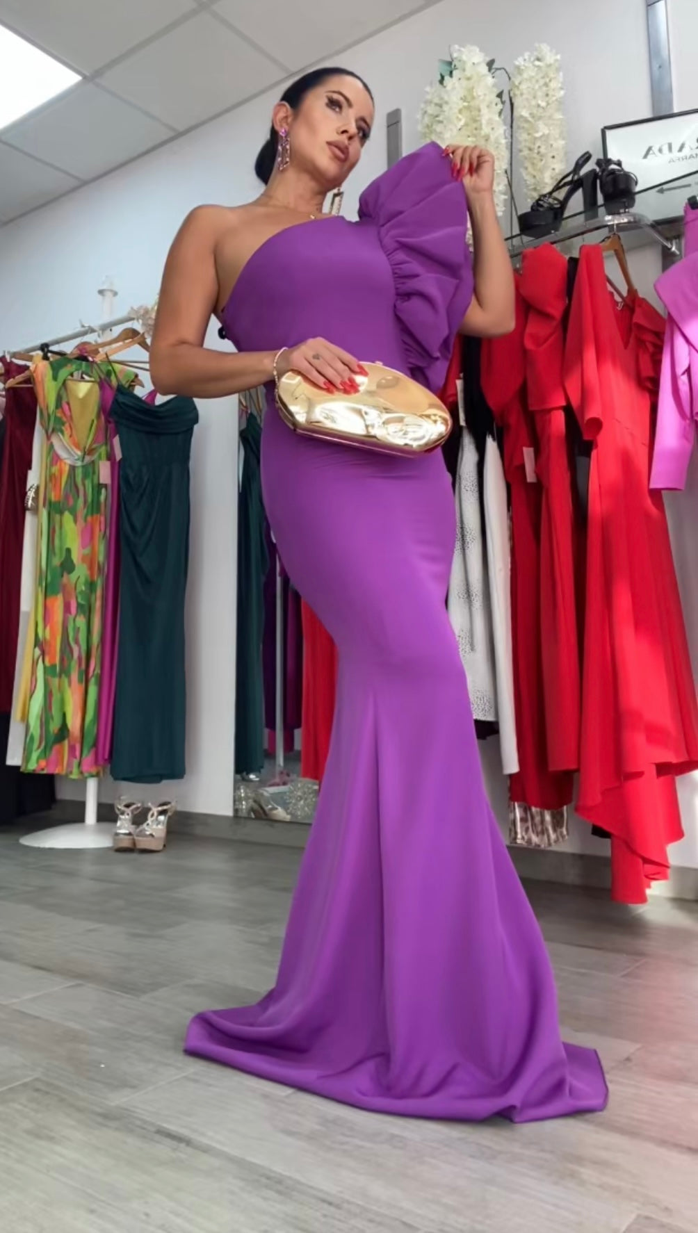 Confeccionado en tejido crepe tela con algo de licra,lleva forro de licra al tono,corte entallado sirena con cola, manga asimétrica con precioso detalles de doble volantes en un hombro, cremallera invisible trasera,nuestro diseño Grecia es elegante, sofisticado, original perfecto para tus eventos.FABRICADO EN EPAÑA.