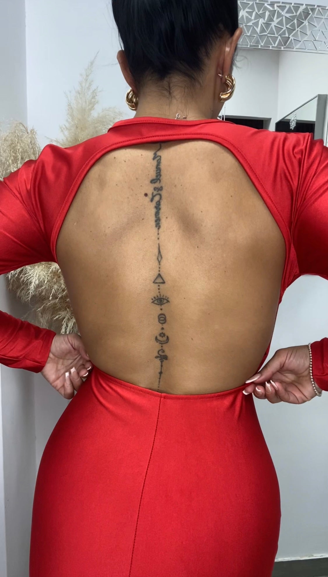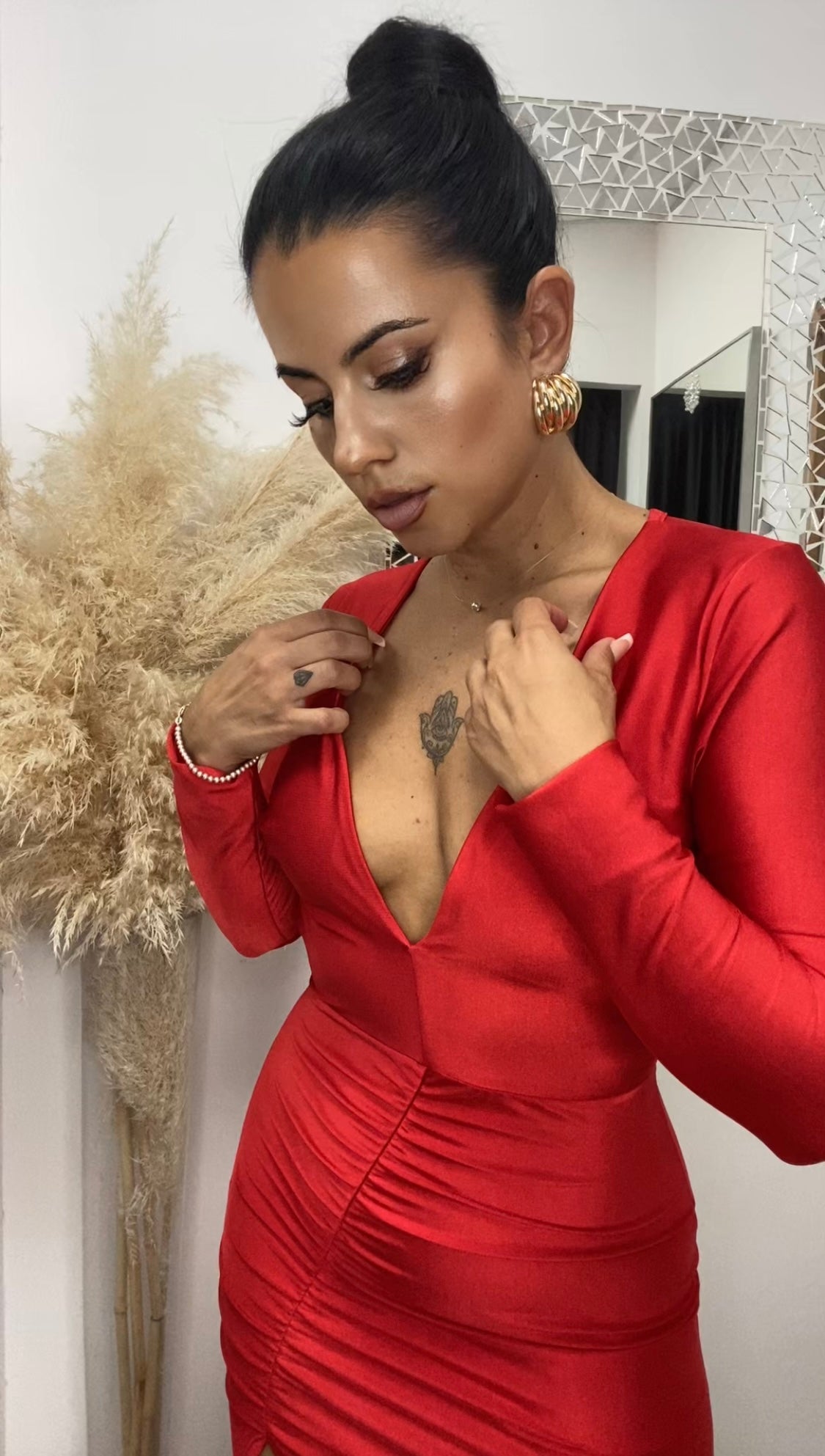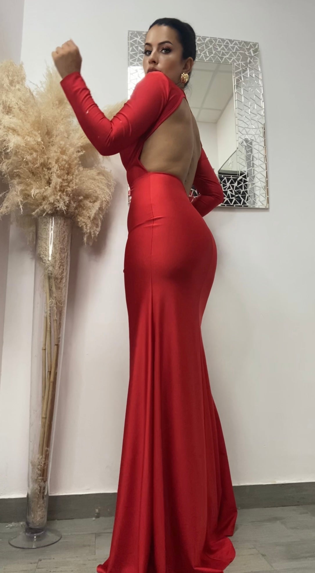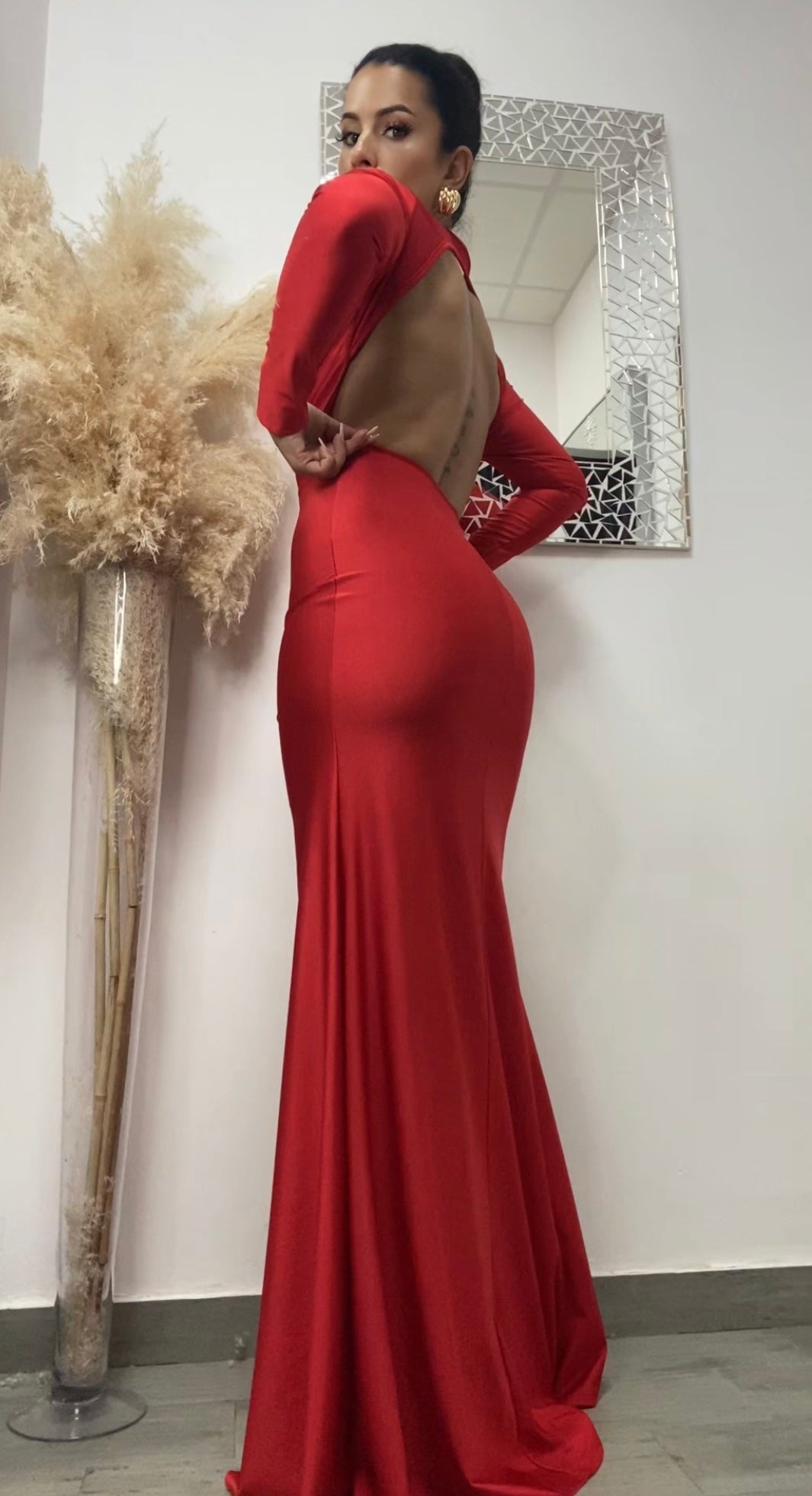 Confeccionado en tejido licra satinada muy cómodo,diseño fruncido con abertura,escote en v, preciosa espalda descubierta, con manga larga, ideal para tus eventos.