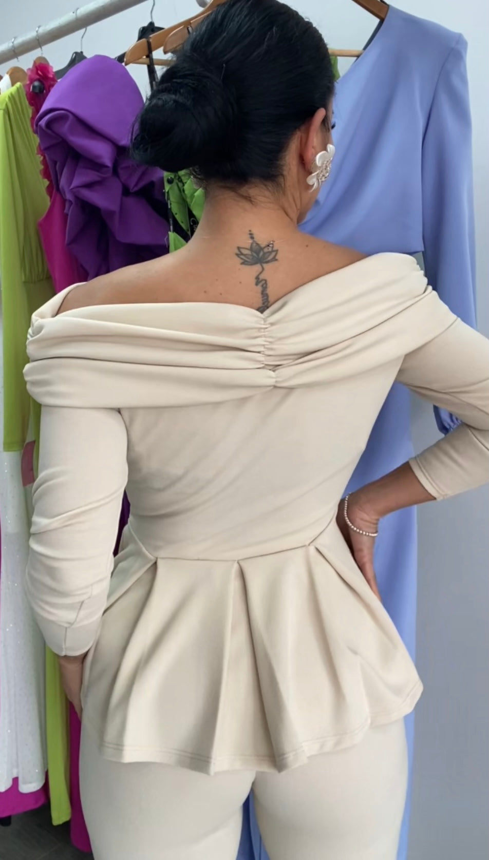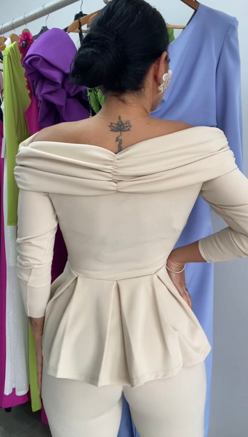 Confeccionado en tejido elastán, pantalón entallado de campana, cintura alta elástica, top escote barco plisado muy favorecedor,detalles de volante en la cintura ideal para disimular la zona de la barriguita, perfecto para cualquier evento.