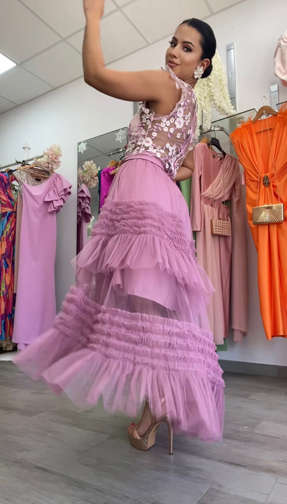 Confeccionada en tejido tull con diseño de volantitos,lleva forro, es más corta por delante que por detrás,cintura elástica se adapta a tu talla,ideal para cualquier ocasión.