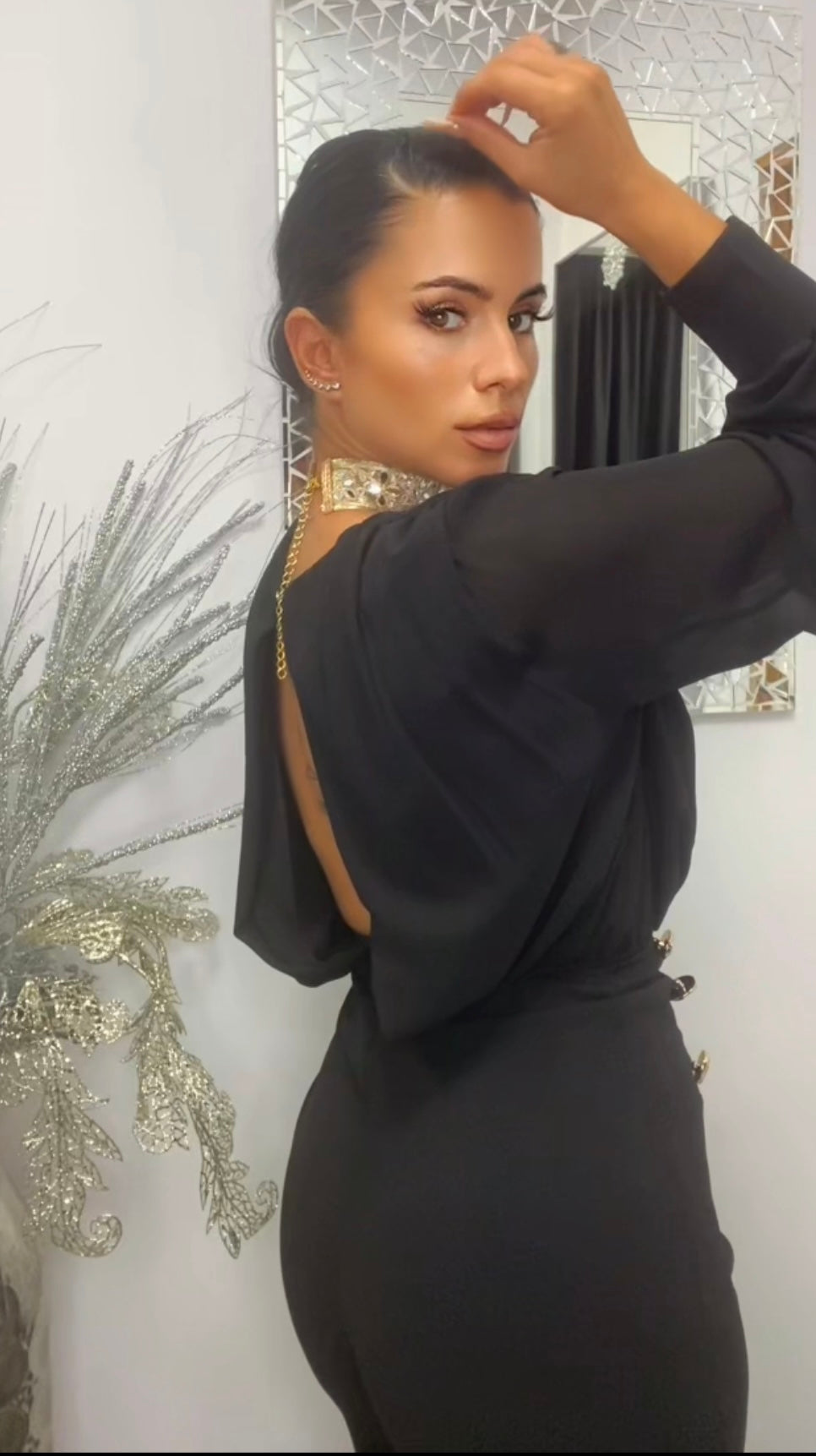 Confeccionado en tejido elastán, corte entallado con campana,detalles de botones dorados,combinación en gasa la parte de arriba,lleva espalda con abertura,cremallera invisible trasera.
