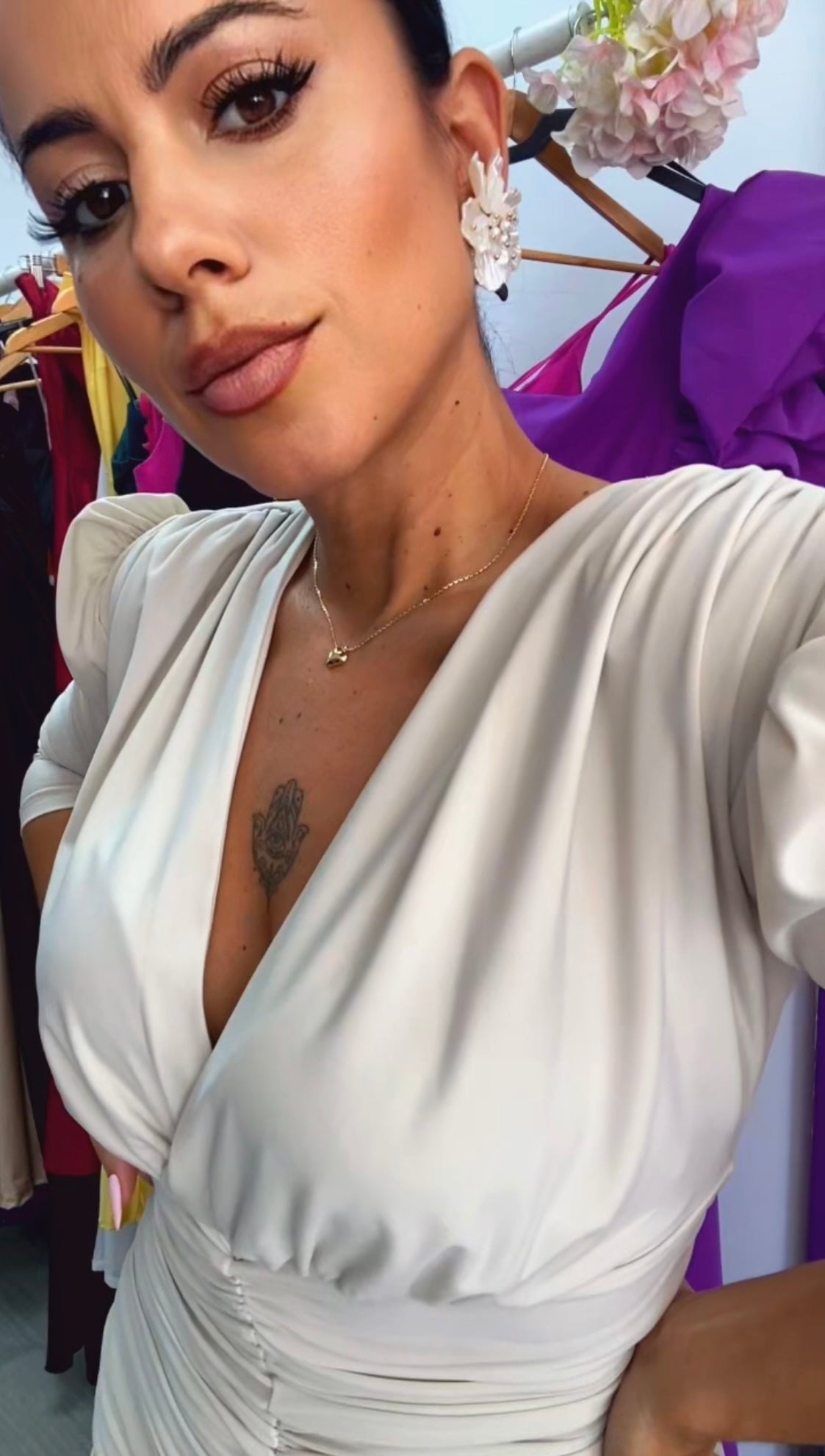 Confeccionado en punto de seda,licra, cómodo,elegante con un diseño muy favorecedor,largo midi con abertura delantera, frunce en la zona de la barriguita ideal para disimularla,escote en v,mangas abullonadas,incluye hombreras.FABRICADO EN ESPAÑA.