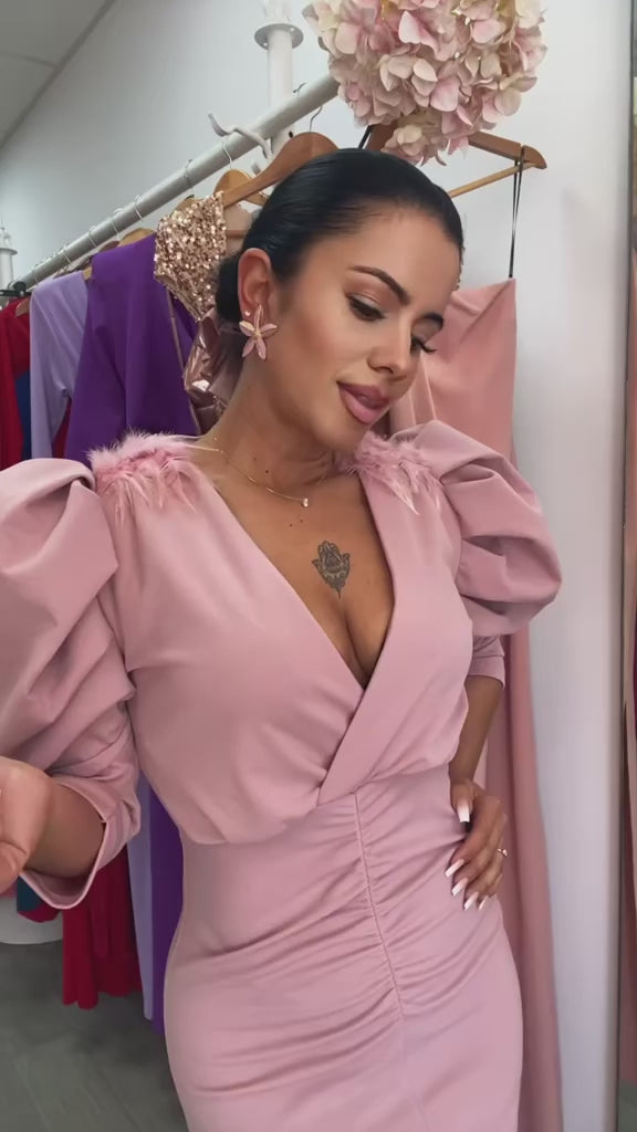 Confeccionado en tejido elastán tupido,corte entallado con diseño drapeado en cintura,abertura delantera,escote en v muy favorecedor,mangas abullonadas con detalles de plumas en los hombros,cremallera invisible trasera,ideal para tus fiestas y eventos.