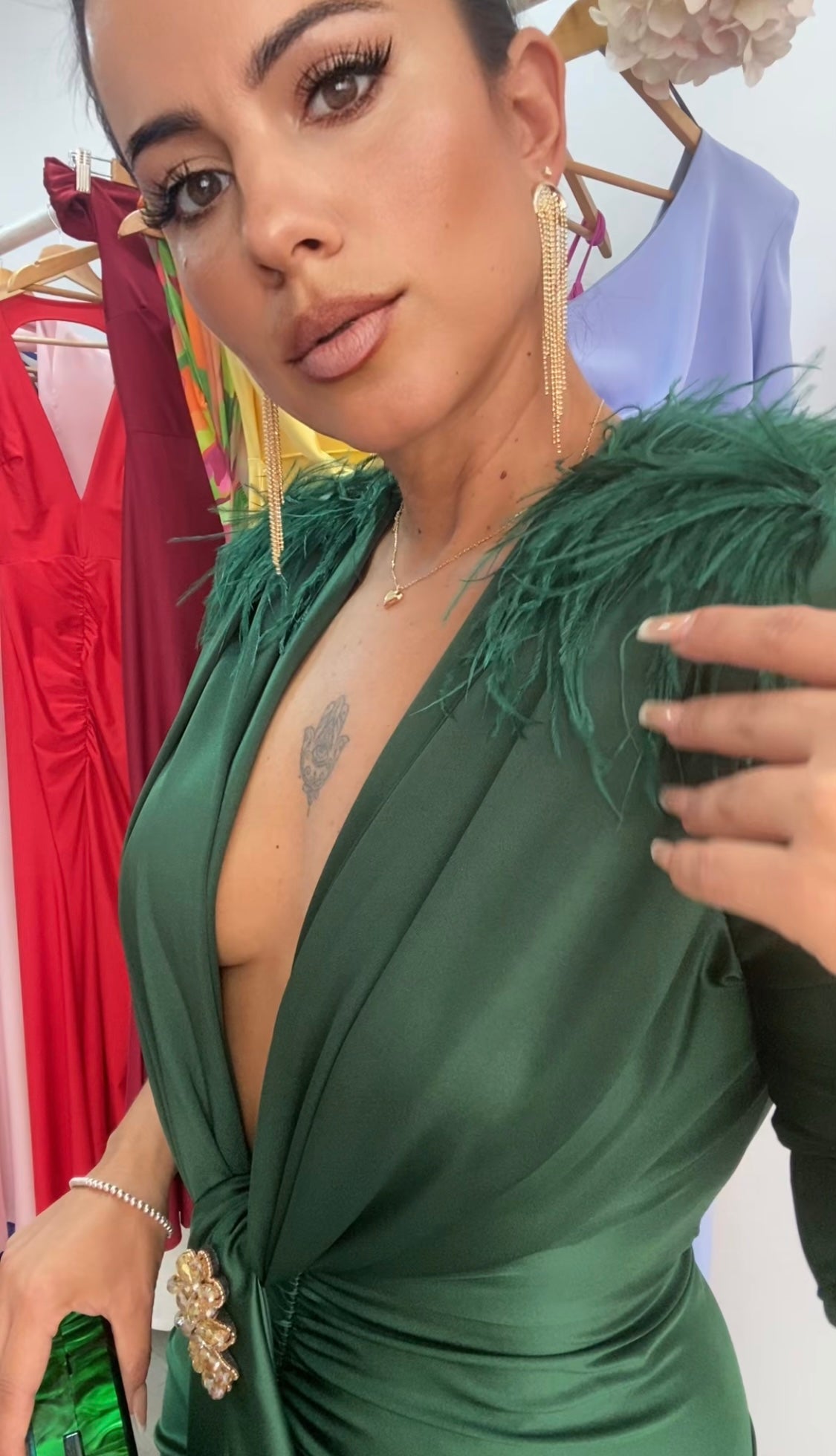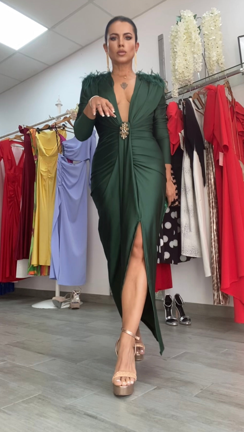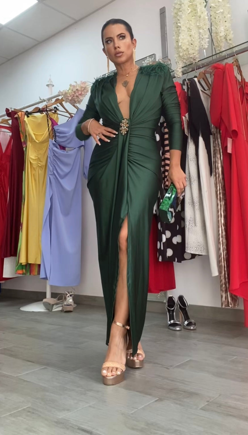 Confeccionado en tejido licra tupida satida,corte entallado,con drapeado en cintura ideal para disimular la zona de la barriguita,escote en v con opción de cerrarlo,abertura en una pierna,precioso detalle de plumas en los hombros,detalle de broche en cintura,incluye hombreras,este diseño exclusivo en nuestras tiendas es elegante,cómodo y muy versátil,perfecto para cualquier tipo de eventos.