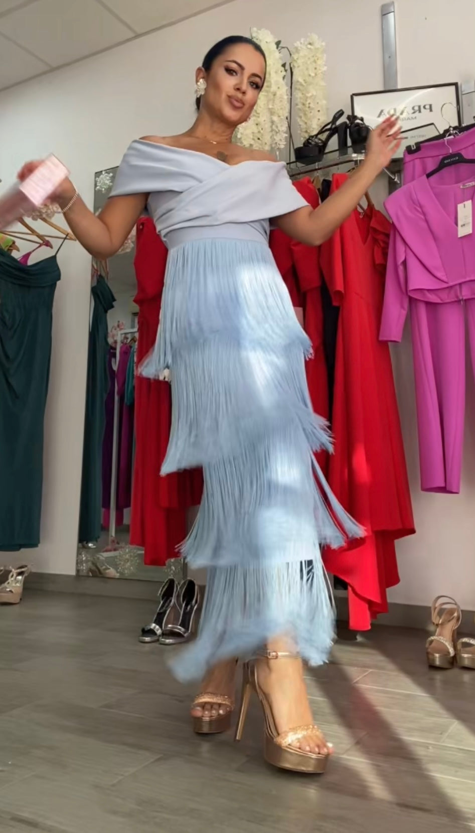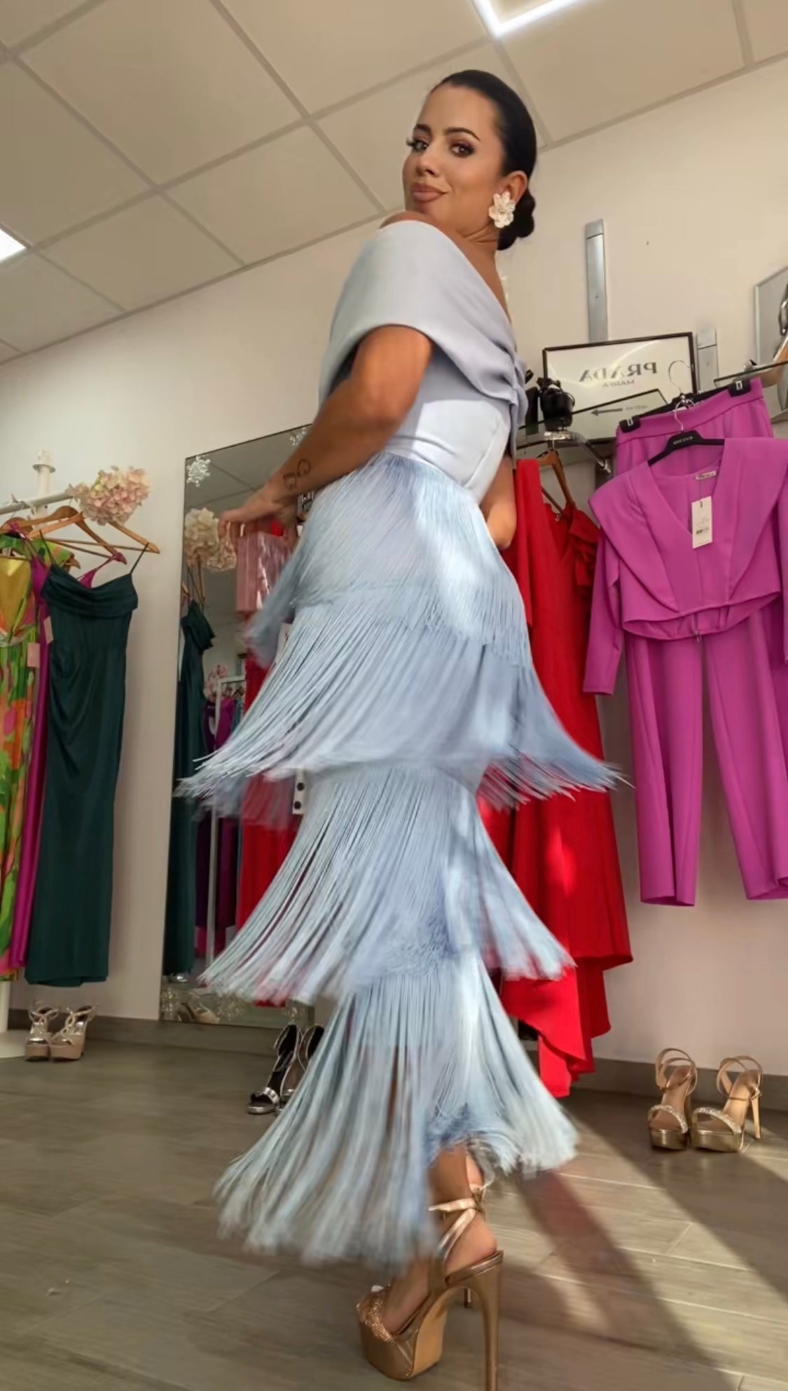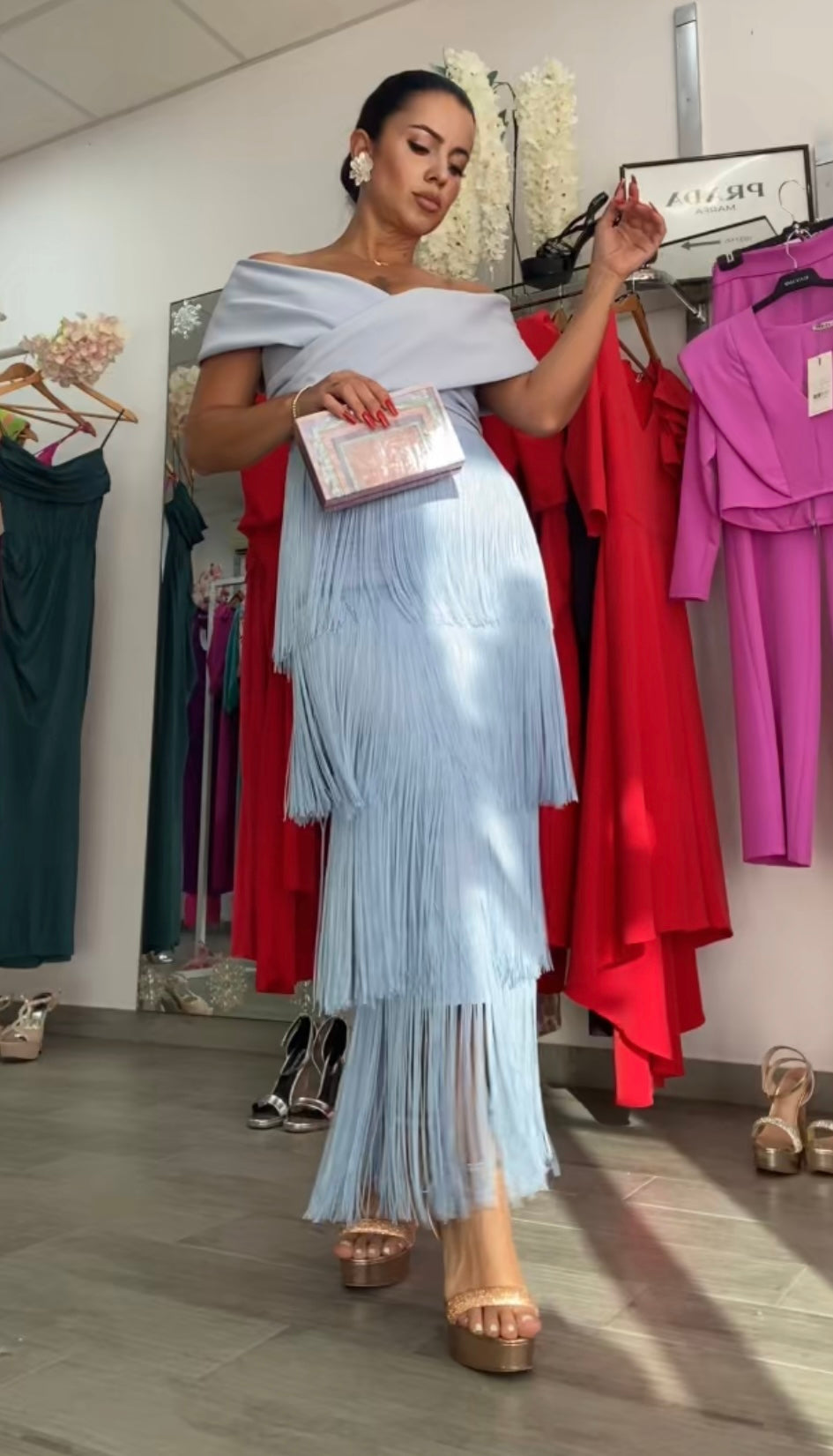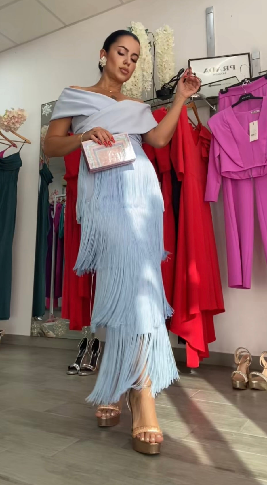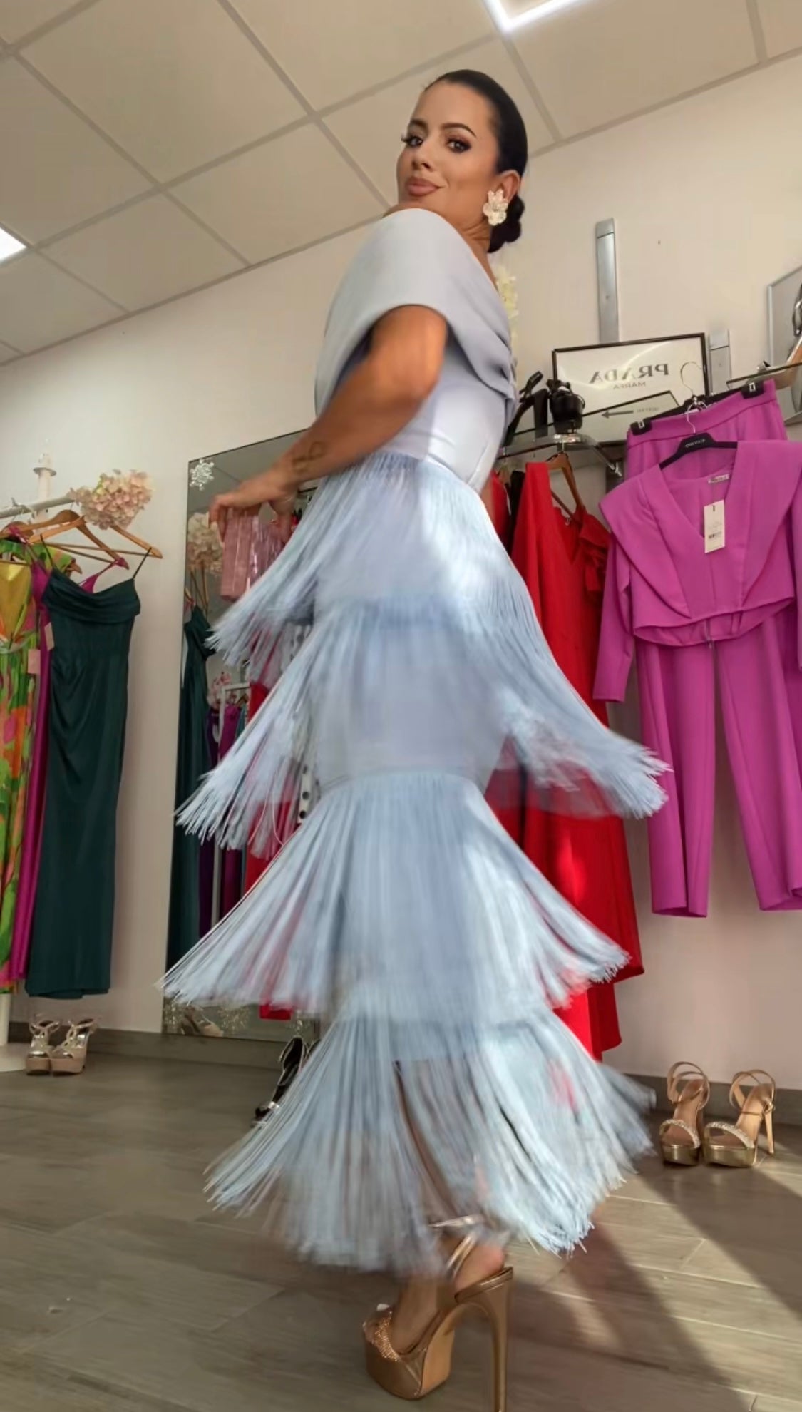 Confeccionado en tejido crepe, tela con algo de licra, lleva forro de licra en su interior, varias capas de flecos, escote corazón y barco muy elegante y favorecedor,con detalle plisado en el pecho, largo midi , cremallera invisible trasera, nuestro Vestido Celeste es perfecto para cualquier evento, FABRICADO EN ESPAÑA.