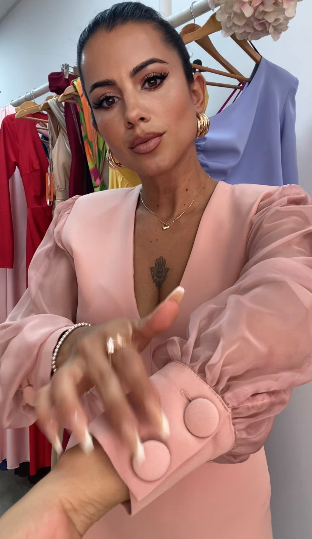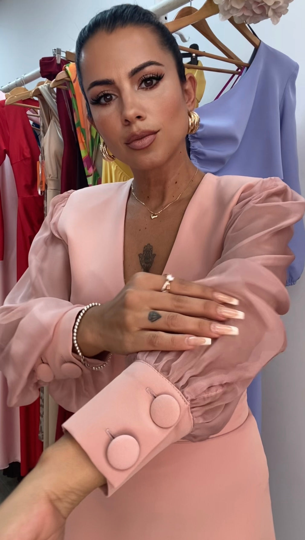 Precioso vestido confeccionado en tejido crepe, tela con algo de licra,lleva forro, diseño entallado pero no demasiado,detalle en cintura,escote en v, preciosa manga de gasaen seda con puño ancho y detalles de botones forrados al tono, incluye hombreras, cremallera invisible trasera,nuestro diseño Chia es elegante, cómodo, versátil, perfecto para tus eventos.FABRICADO EN ESPAÑA.
