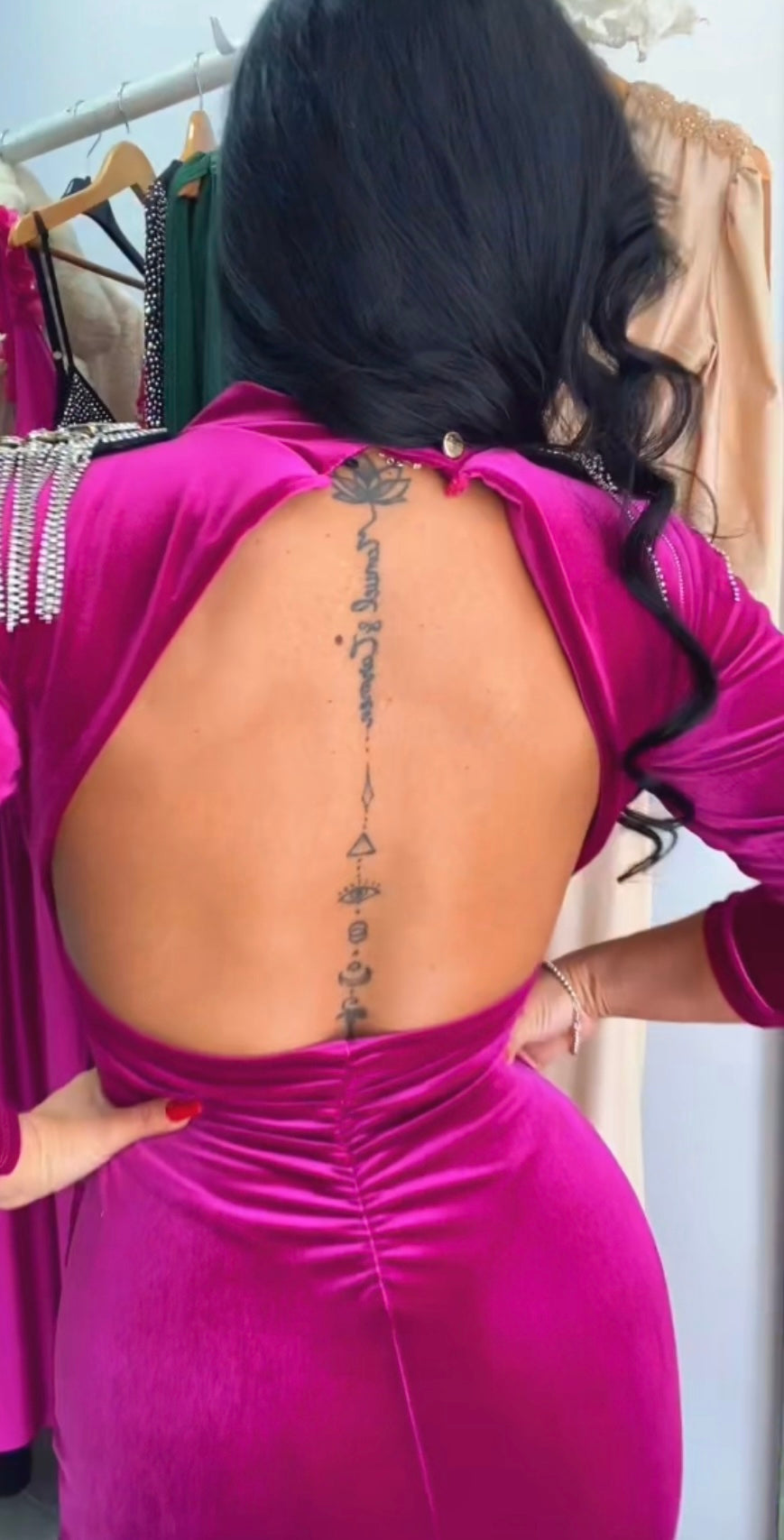 Confeccionado en terciopelo elástico,corte entallado con abertura en el lado,precioso detalles en los hombros de pedrería,espectacular espalda descubierta,con fruncido brasileño en el culete,perfecto para fiestas,bodas.....