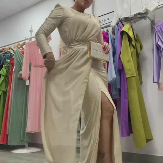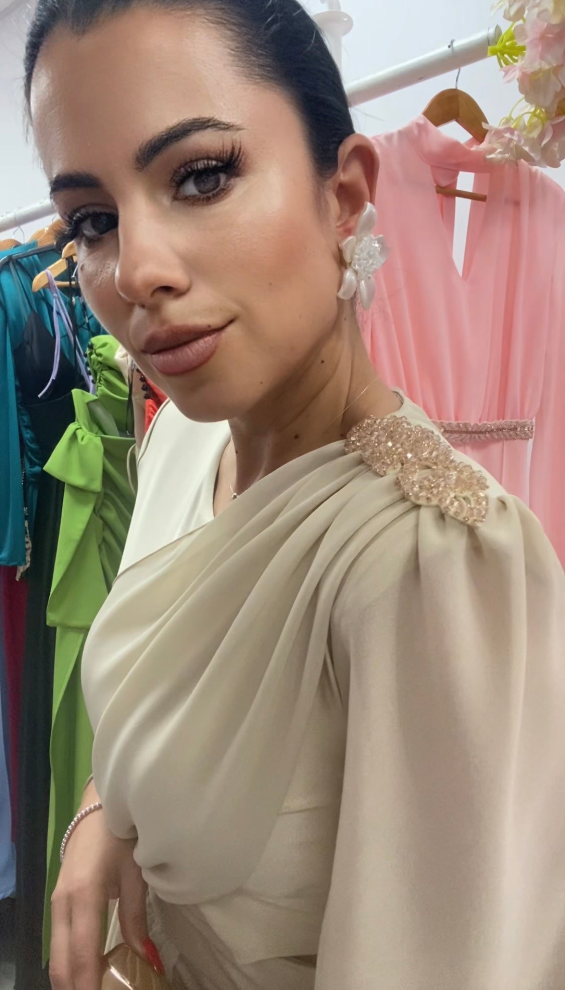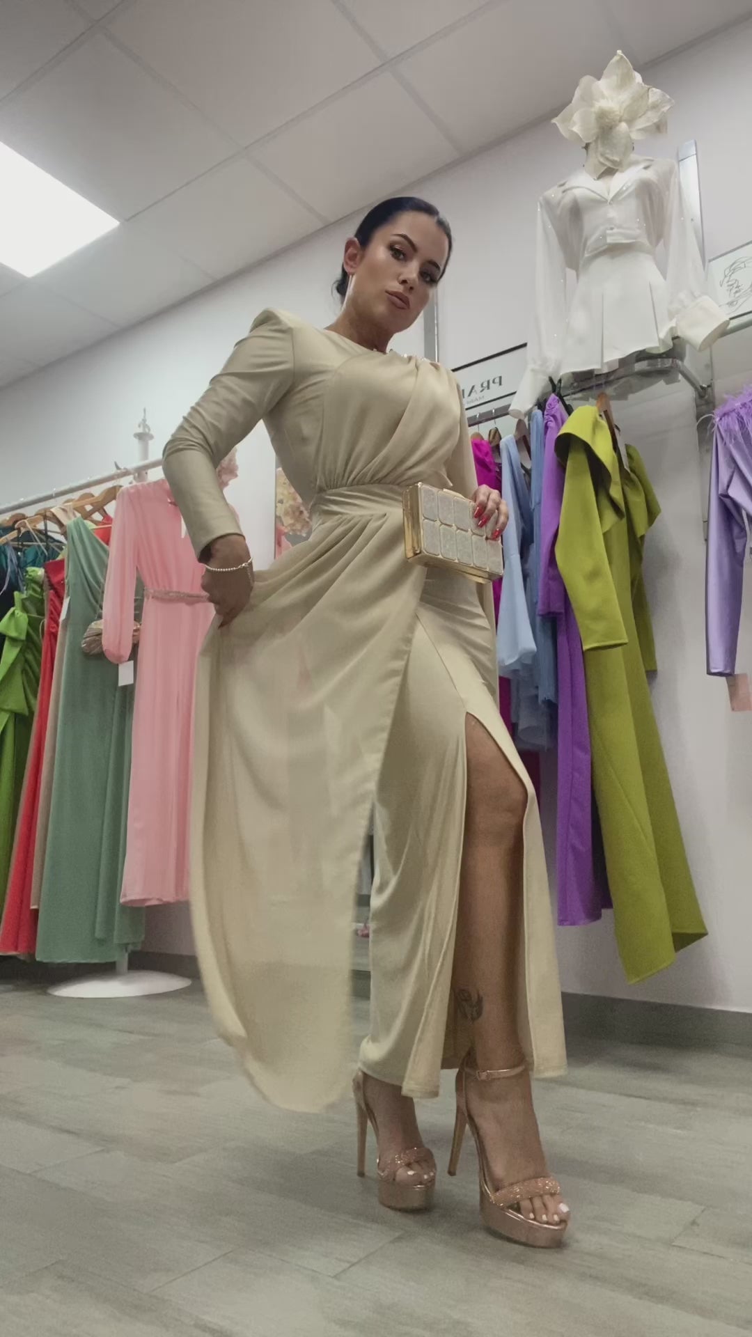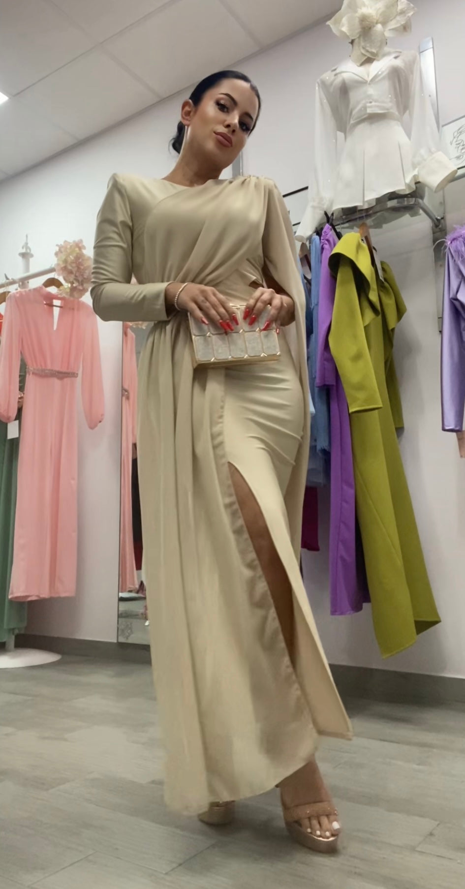 Espectacular vestido en tejido licra tupida satinada,corte entallado con abertura en la pierna,preciosa combinación en gasa en la parte de la cintura que te disimula la barriguita y en la manga,incluye hombreras y detalle de pedrería al tono,abrocha con botón en la zona del cuello,ideal para bodas,bautizos y comuniones