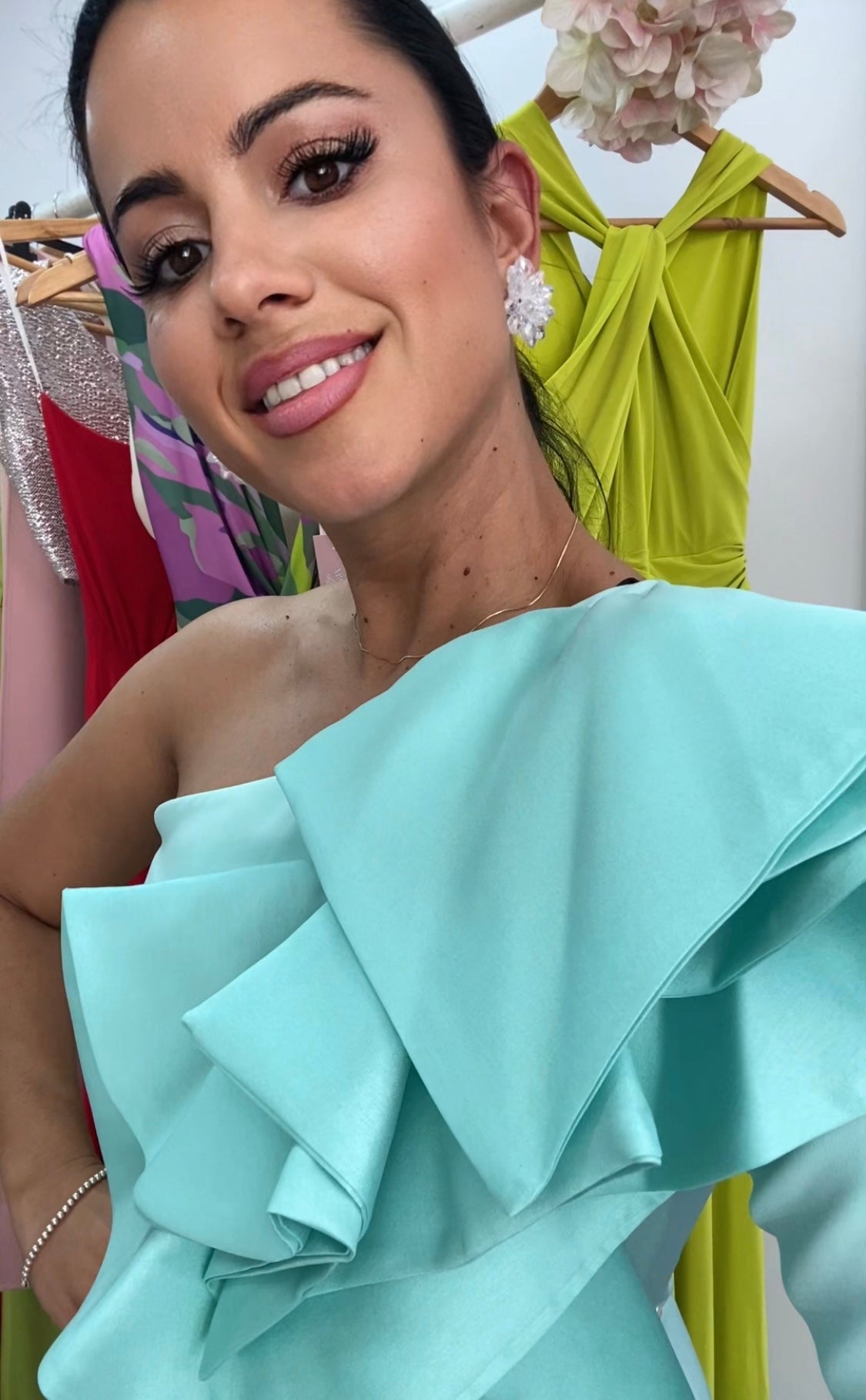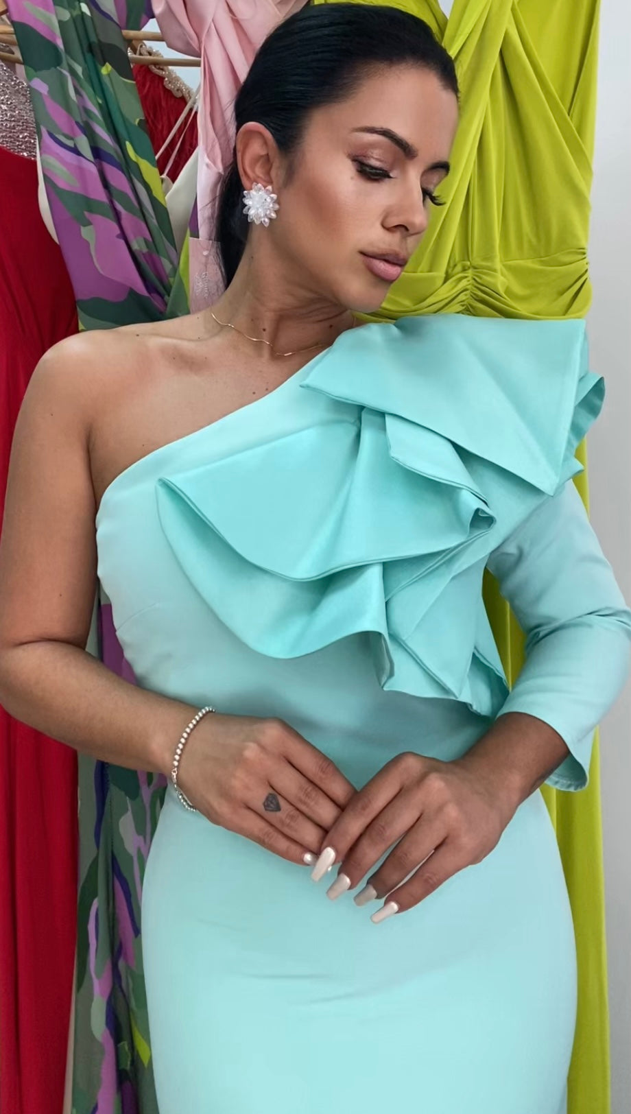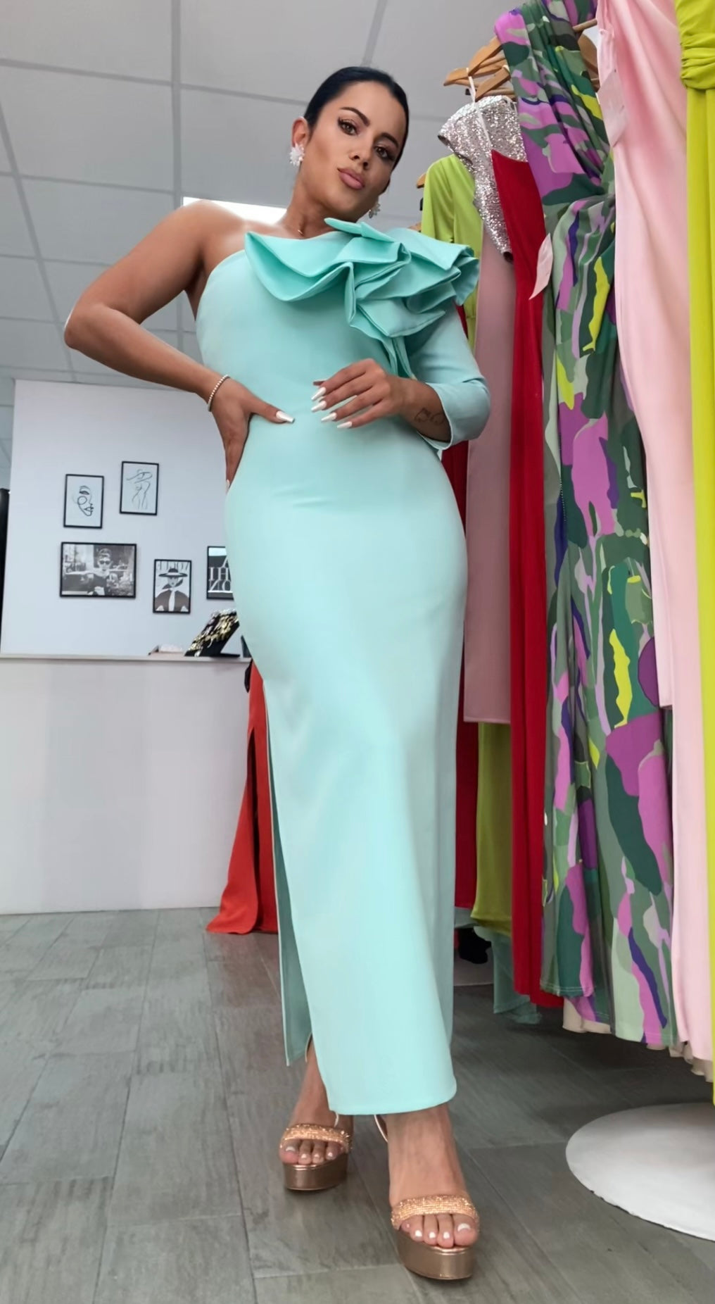 Espectacular vestido confeccionado en tejido crepe tela con algo de licra,lleva forro de licra en su interior.corte entallado, largo midi,maga asimétrica con detalles de volantes en el hombro derecho,abertura en el lado,cremallera invisible trasera, perfecto para tus fiestas y eventos.