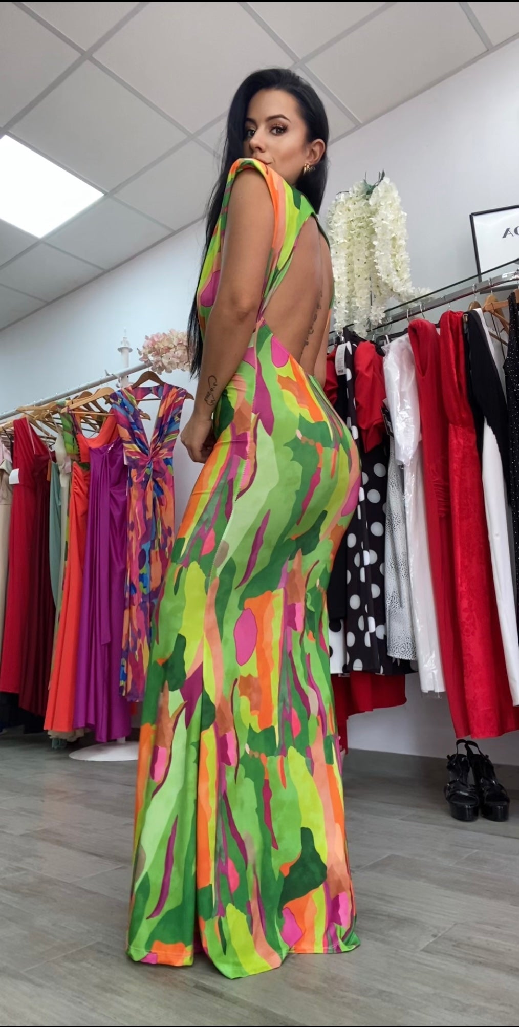 Precioso vestido confeccionado en tejido de licra,con una variedad de colores muy favorecedores,corte entallado,escote en v y una espectacular espalda descubierta,incluye hombreras,perfecto para tus eventos,nuestro vestido Jamaica es original,elegante,alegre y muy cómodo.