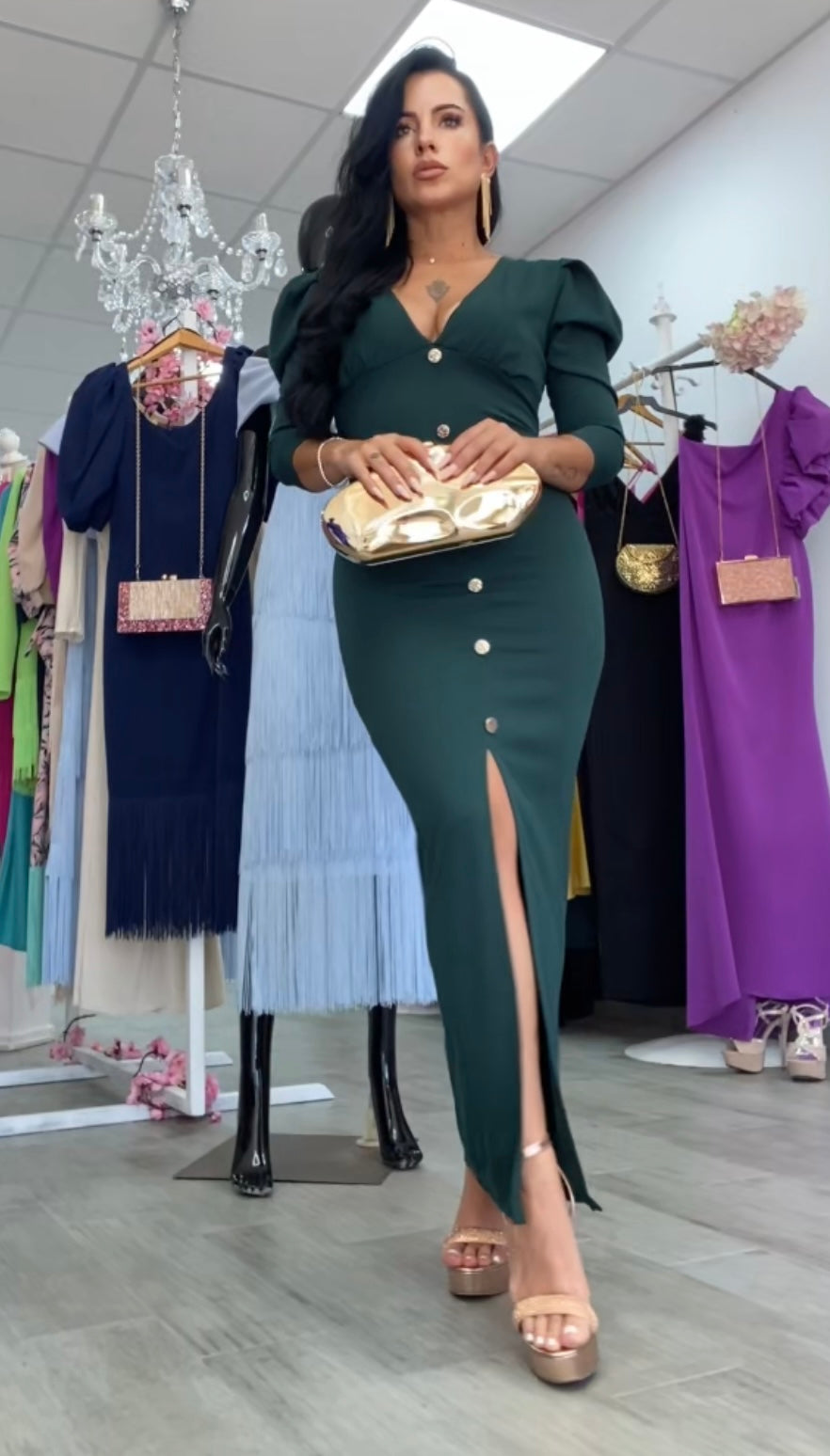 Confeccionado en tejido elastán,corte entallado,con abertura, detalles de botones dorados,escote en v,ideal para cualquier evento.