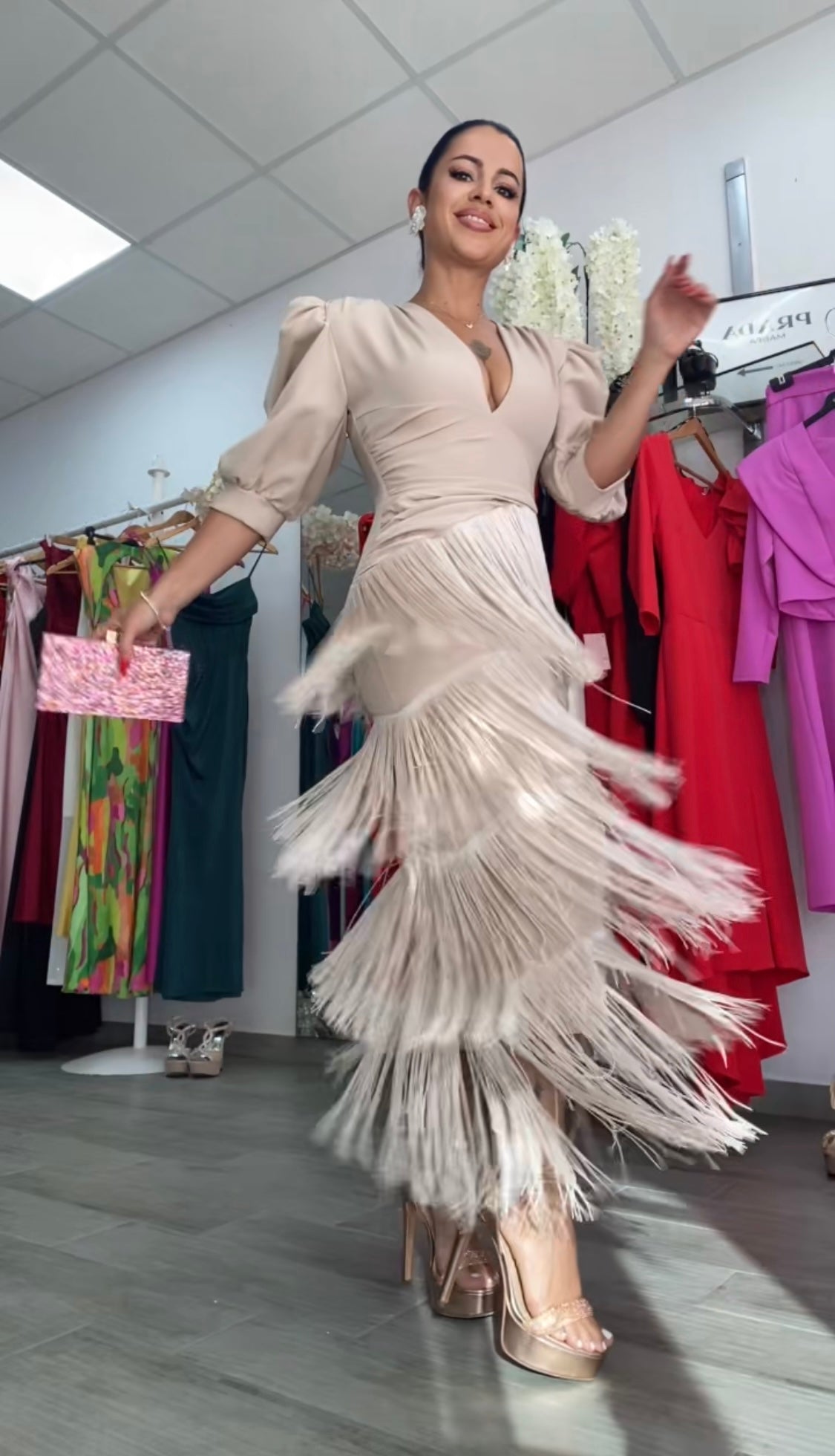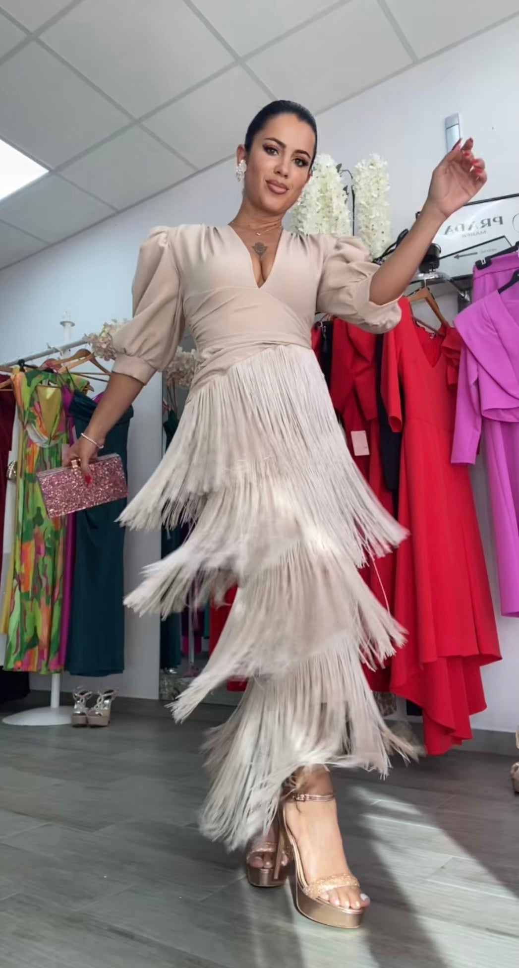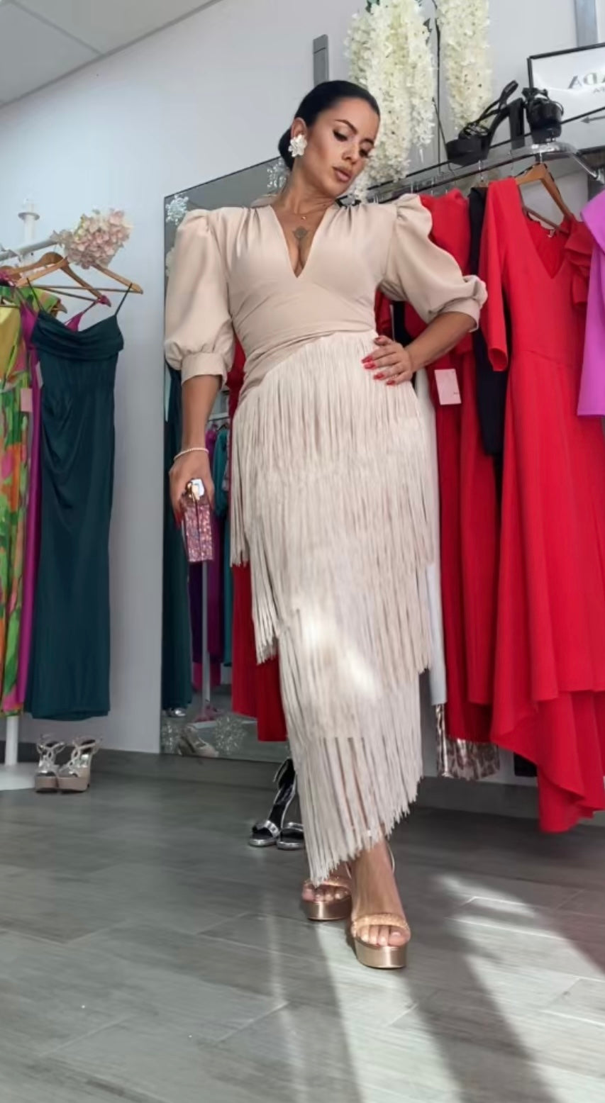 Precioso vestido confeccionado en crepe, tela con licra,súper bonito y de buenísima calidad,y capas de flecos,corte entallado con abertura trasera, largo midi,escote en v muy favorecedor, preciosas mangas abullonadas,lleva hombreras,cintura drapeada ideal para disimular la zona de la barriguita,lleva cremallera trasera.Nuestro diseño Triana es perfecto para todo tipo de eventos bodas,comuniones,bautizos, ferias....FABRICADO EN EESPAÑA.