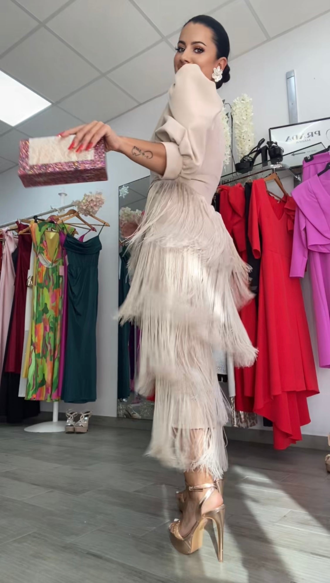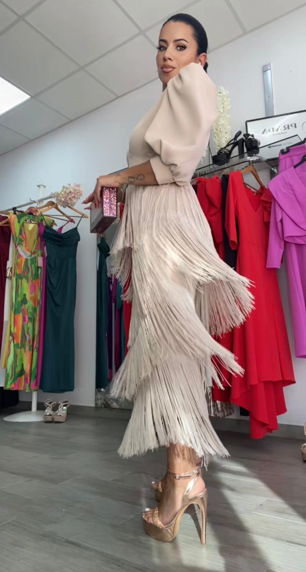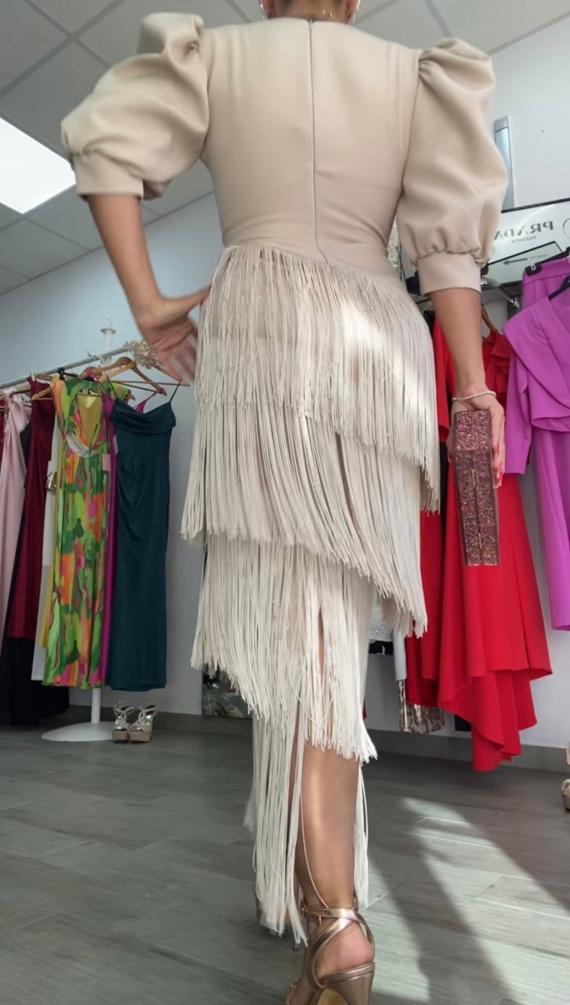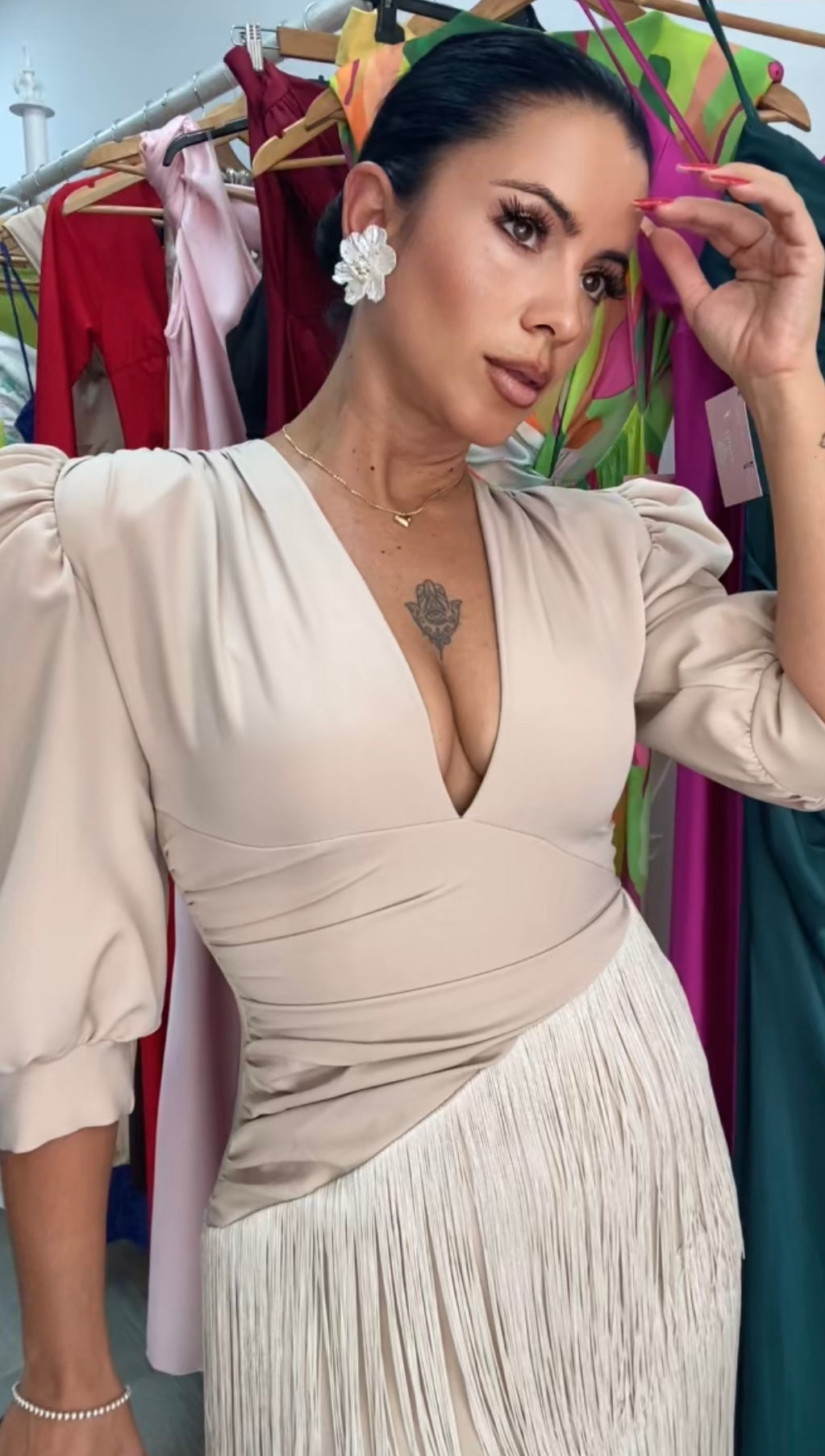Precioso vestido confeccionado en crepe, tela con licra,súper bonito y de buenísima calidad,y capas de flecos,corte entallado con abertura trasera, largo midi,escote en v muy favorecedor, preciosas mangas abullonadas,lleva hombreras,cintura drapeada ideal para disimular la zona de la barriguita,lleva cremallera trasera.Nuestro diseño Triana es perfecto para todo tipo de eventos bodas,comuniones,bautizos, ferias....FABRICADO EN EESPAÑA.