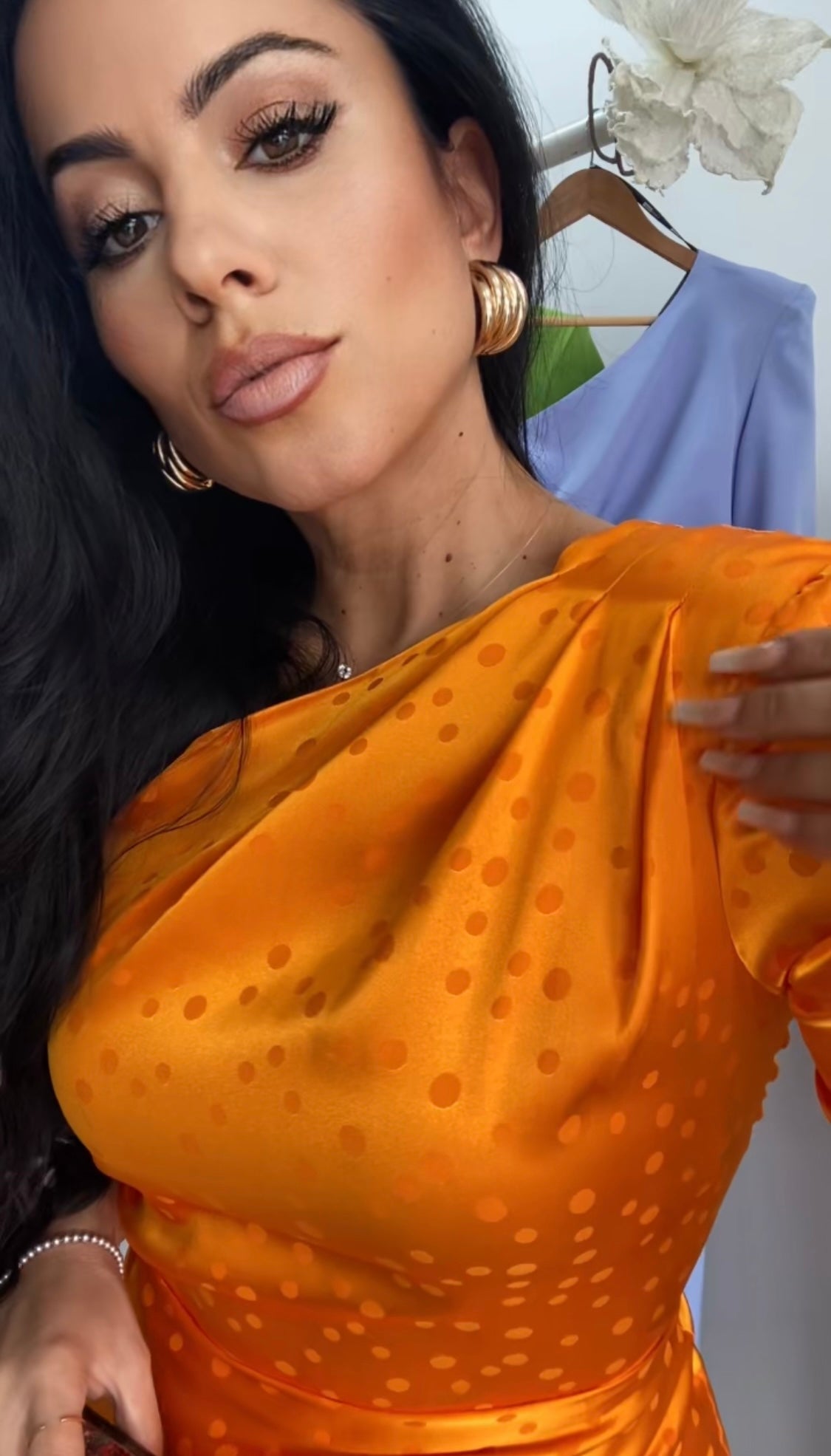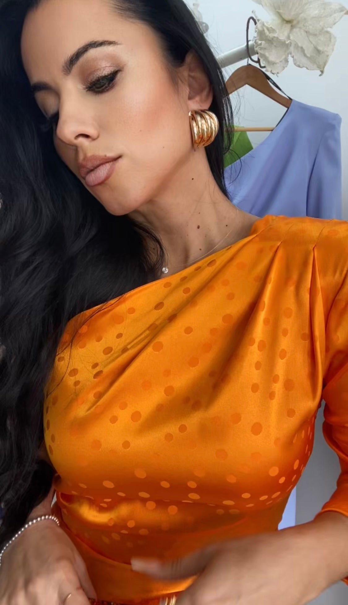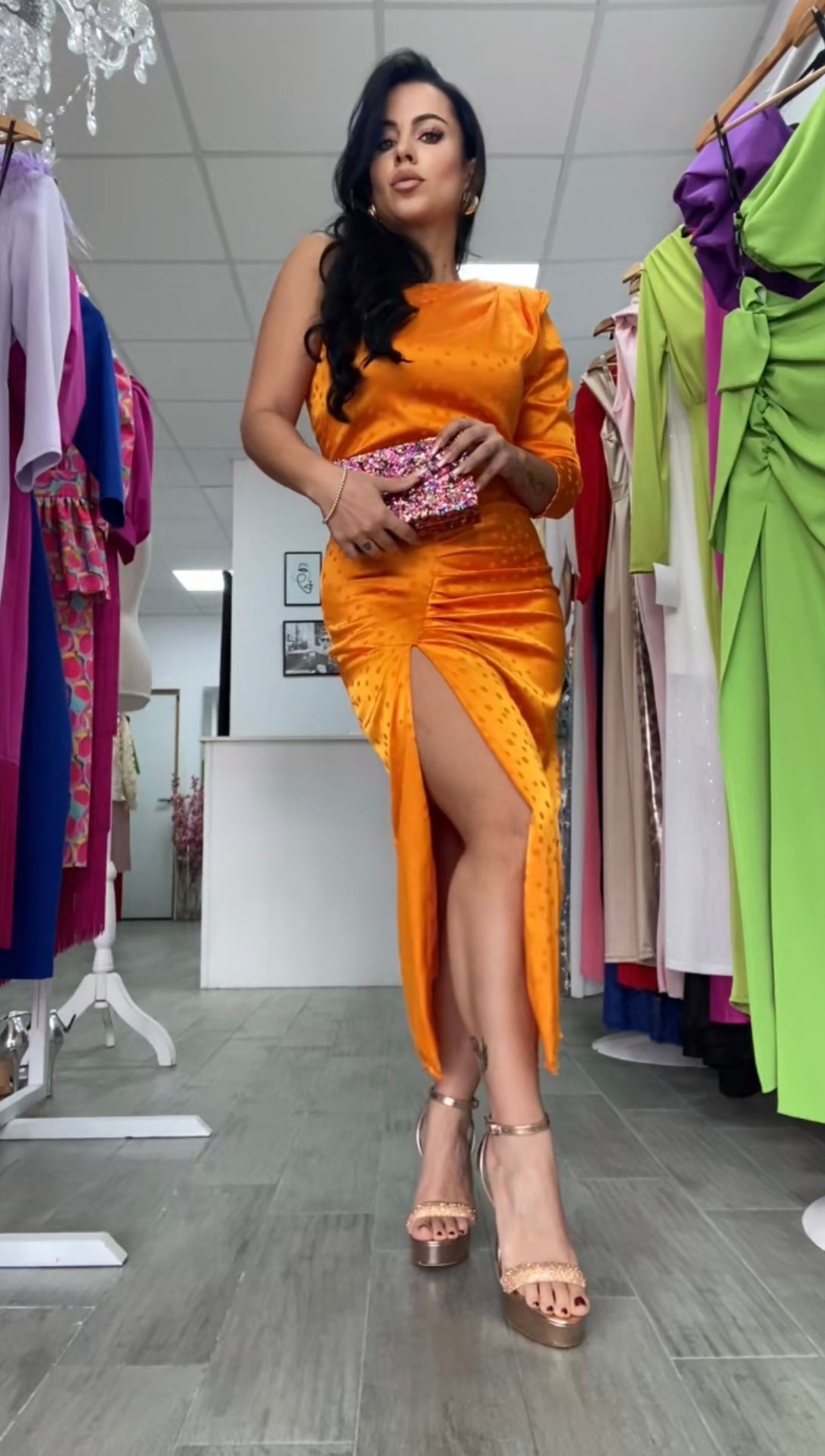 Precioso vestido confeccionado en tejido seda con un estampado de lunar al tono, lleva forro al tono, largo por debajo de rodilla con abertura en una pierna,diseño drapeado en cintura,manga asimétrica con hombreras, cremallera trasera,nuestro diseño Yasmin es elegante,original, versátil.... perfecto para todo tipo de eventos.FABRICACIÓN ESPAÑOLA.