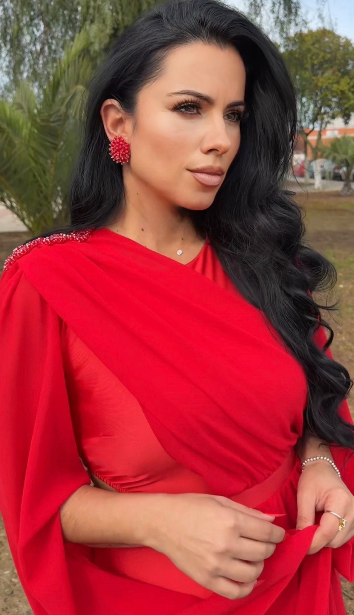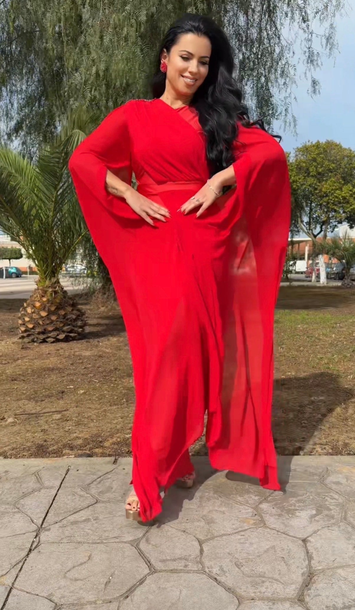 Confeccionado en tejido licra tupida satinada, corte entallado, lleva abertura en la pierna, gasa delantera perfecta para disimular la zona de la barriguita,lleva abertura en un lado de la cintura,preciosas mangas de gasa con detalle de pedreria en el hombro al tono, lleva hombreras, perfecto para esos eventos más especiales, nuestro diseño zeus es elegante,sofisticado y el color rojo intenso lo hace todavía más especial.