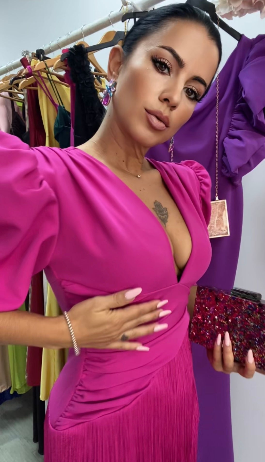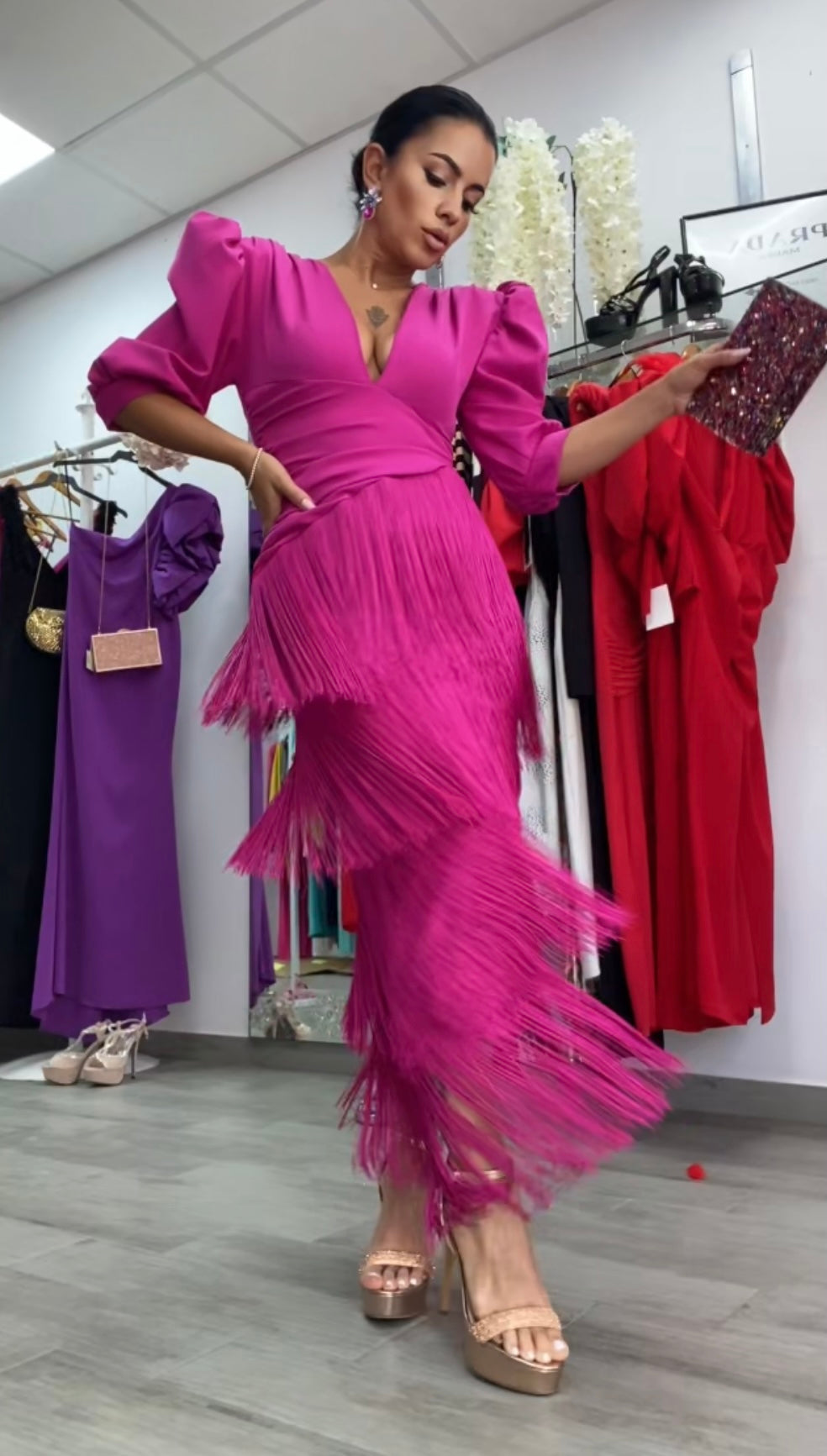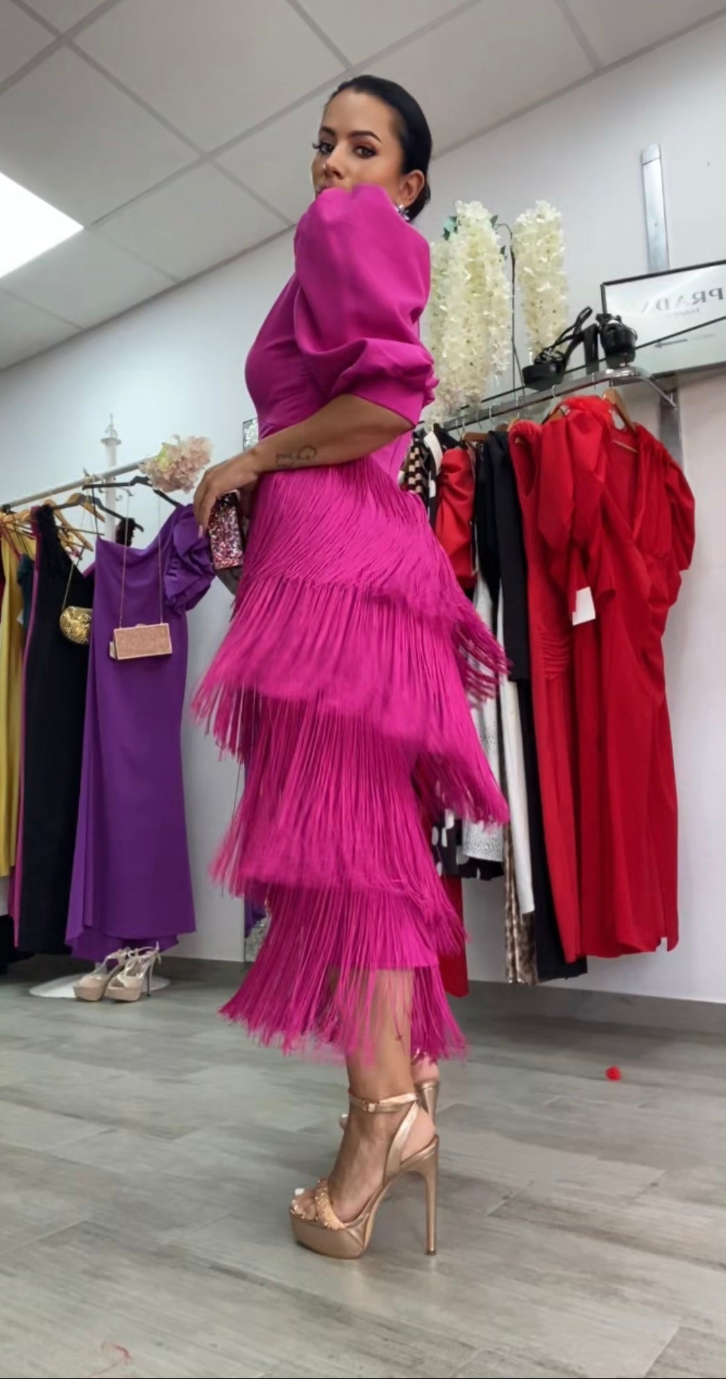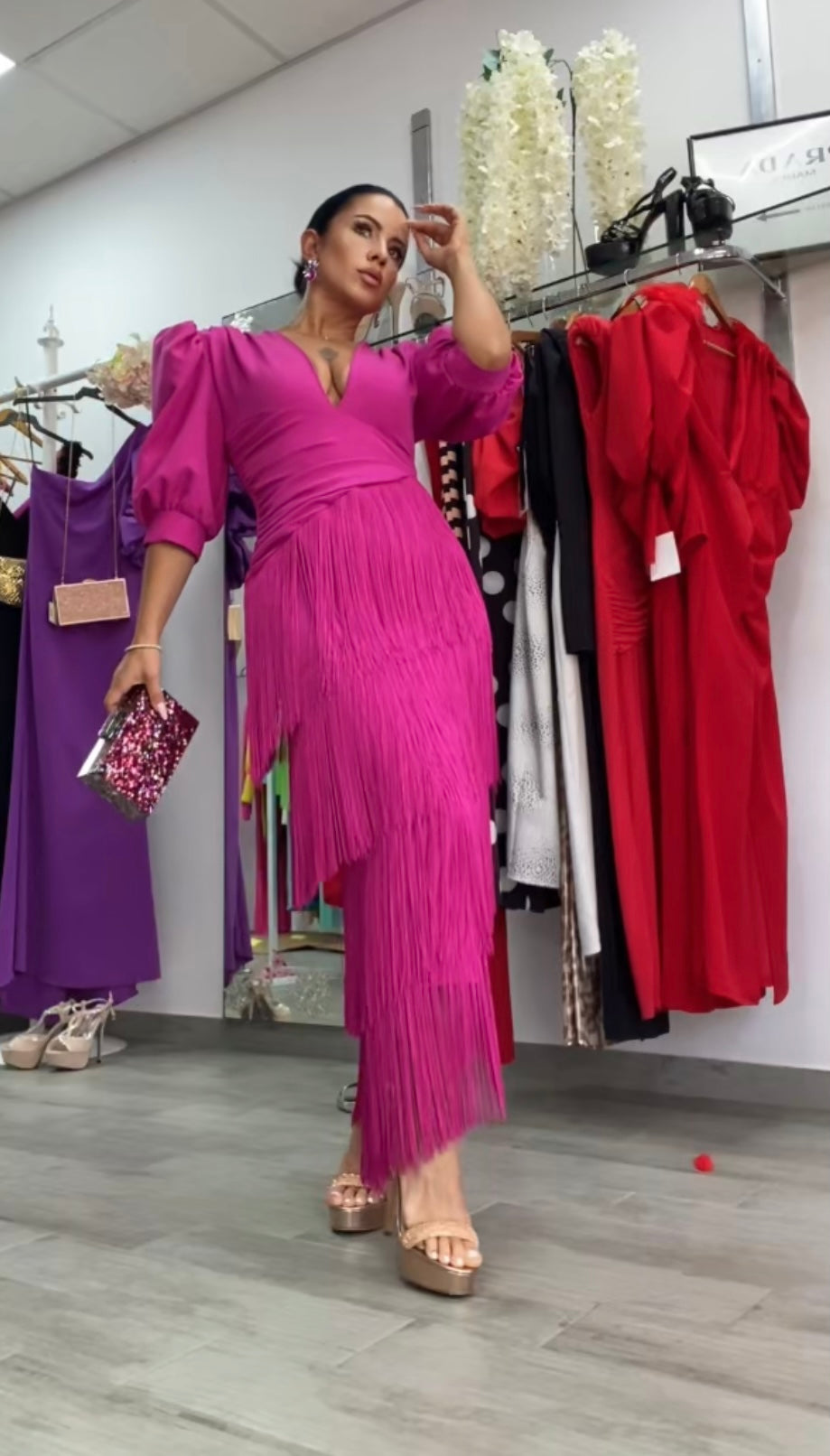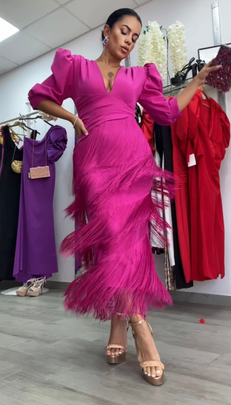 Precioso vestido confeccionado en crepe, tela con licra,súper bonito y de buenísima calidad,y capas de flecos,corte entallado con abertura trasera, largo midi,escote en v muy favorecedor, preciosas mangas abullonadas,lleva hombreras,cintura drapeada ideal para disimular la zona de la barriguita,lleva cremallera trasera.Nuestro diseño Triana es perfecto para todo tipo de eventos bodas,comuniones,bautizos, ferias....FABRICADO EN ESPAÑA.