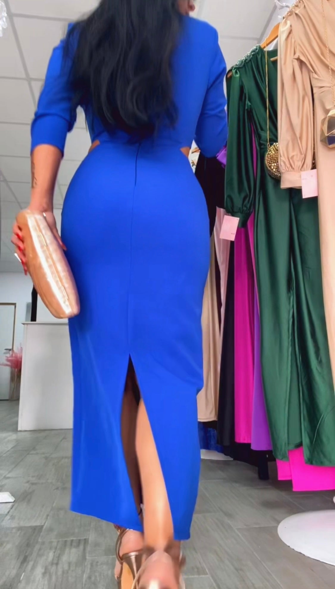 Precioso vestido confeccionado en crepe, tela con algo de licra, lleva forro de licra muy buena calidad,corte entallado con abertura trasera,diseño en cintura con abertura, escote con abertura,incluye hombreras,cremallera invisible trasera,perfecto para tus eventos.FABRICADO EN ESPAÑA.